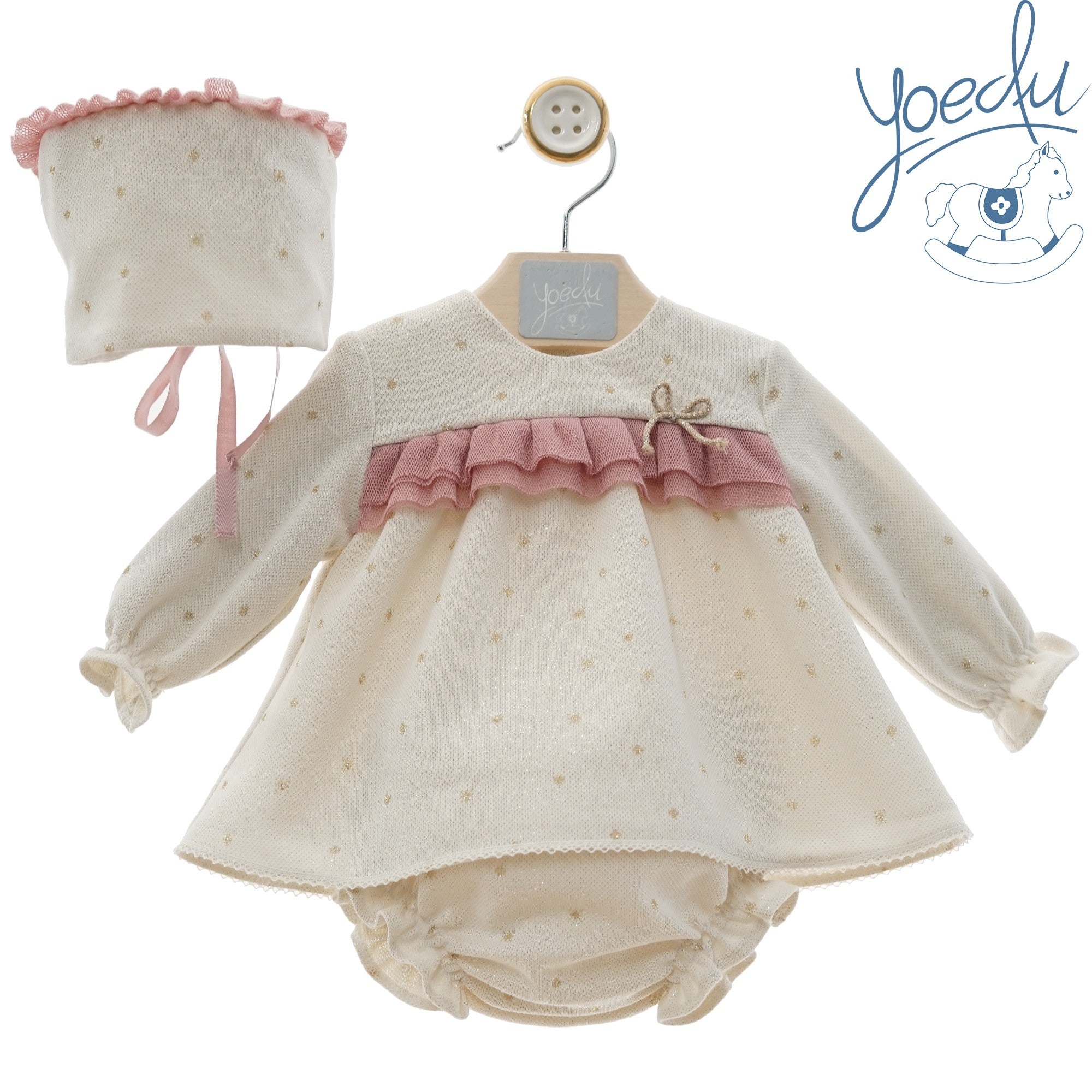 Abito con corpetto in maglina e gonnellone in velluto a coste. Colletto volant a fiori e abbottonatura sul retro con bottoni effetto legno