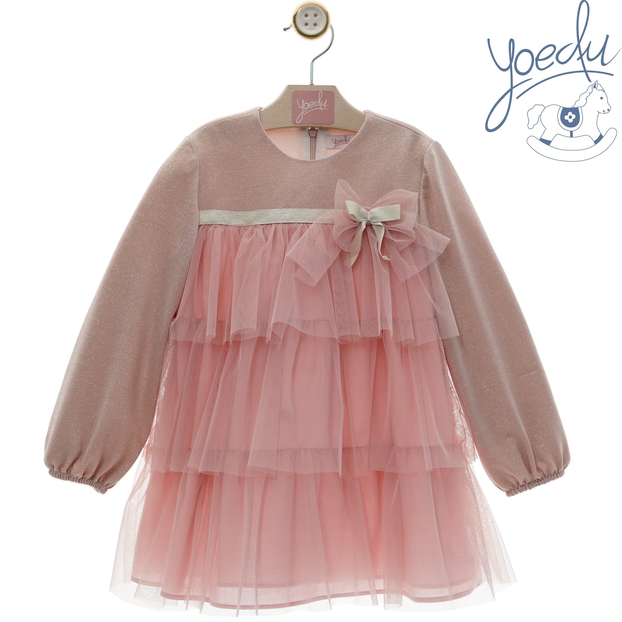 Abito in cotone fantasia con nastrini in velluto sul corpetto. Polsini con elastico interno per facilitare la vestibilità. Foderato