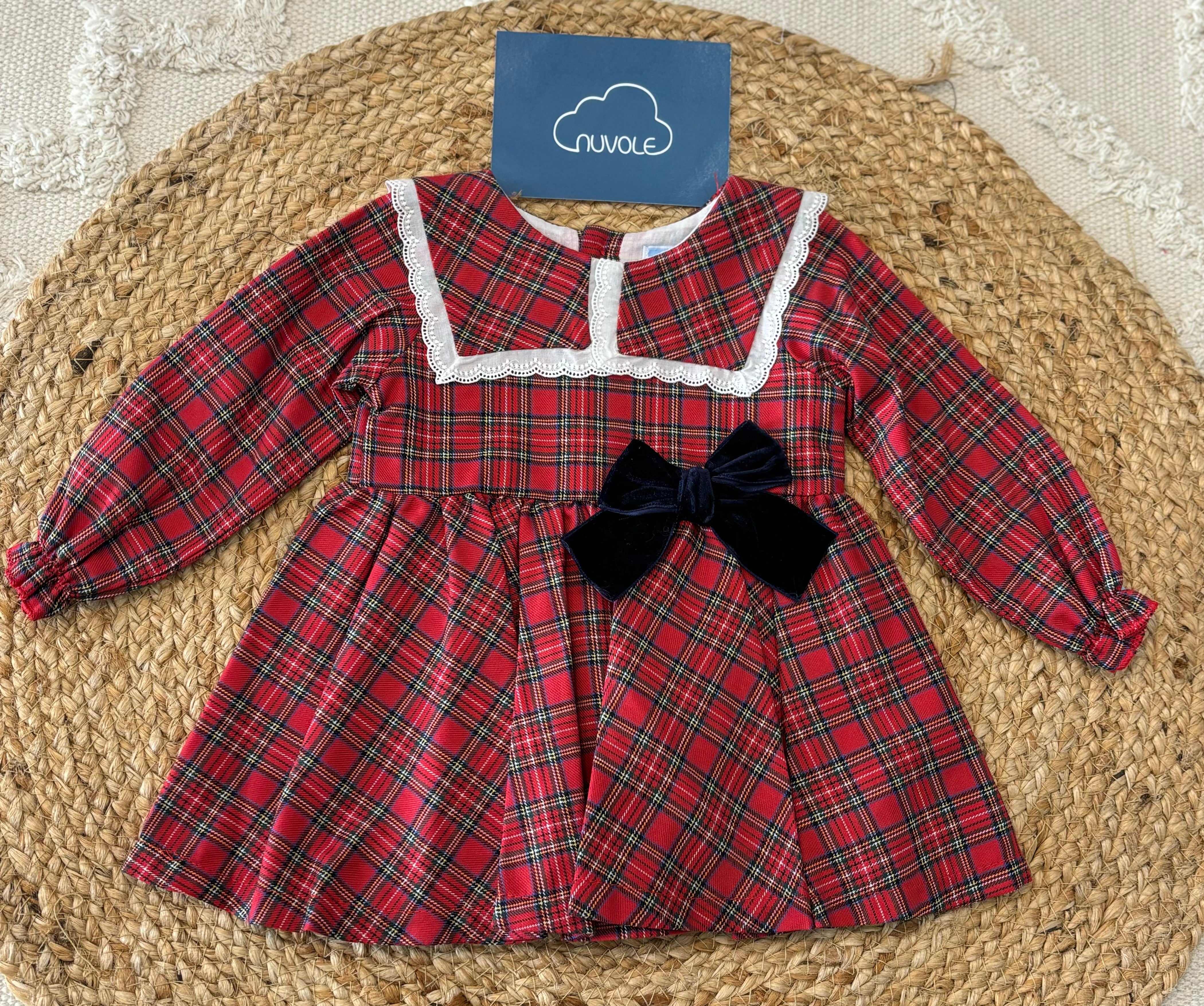 Abito con culotte e cuffietta in cotone fantasia scozzese con fiocco sul davanti. Apertura sul retro con bottoni in madreperla. Foderato