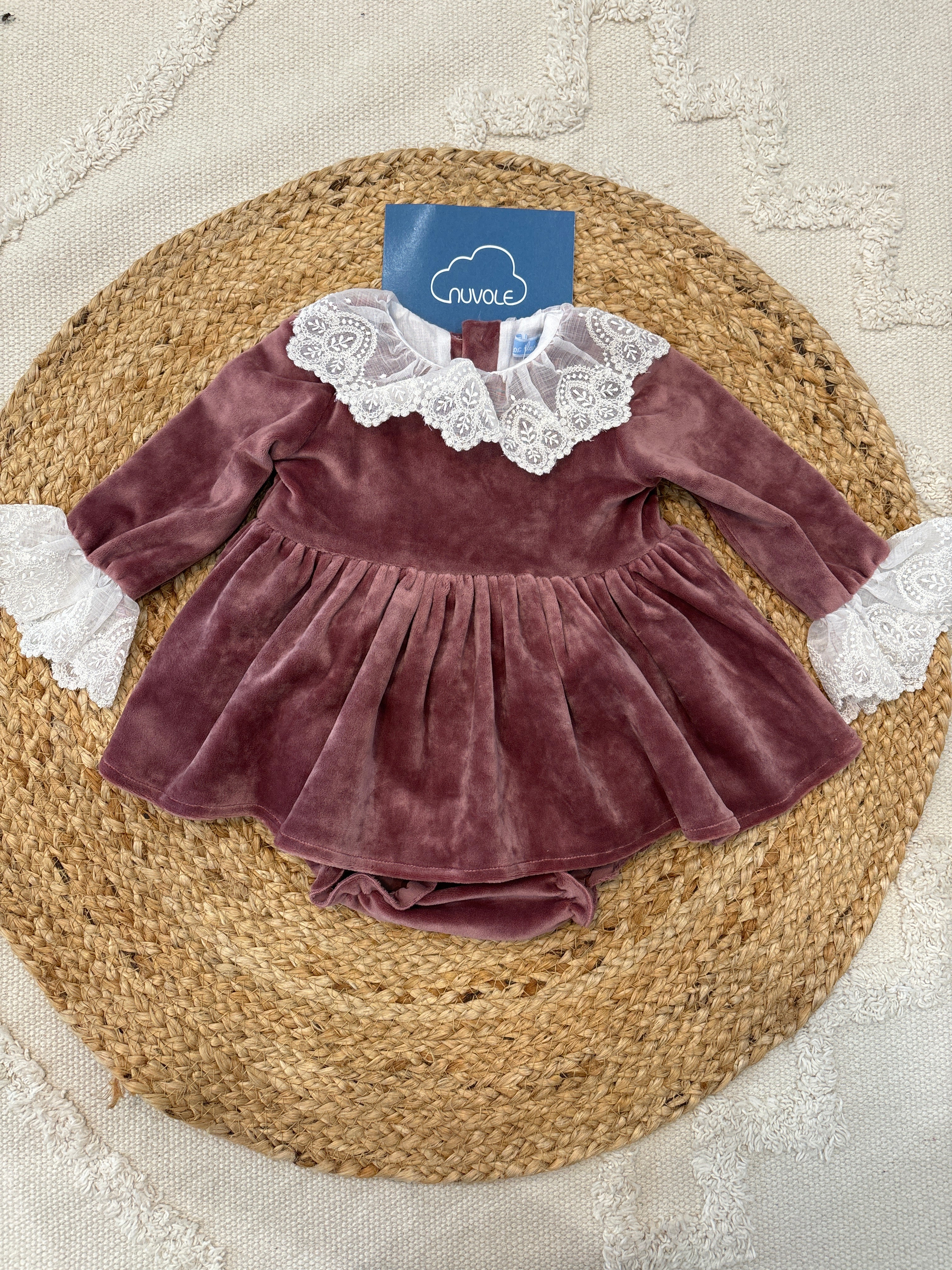 Abito con corpetto in maglina e gonnellone in velluto a coste. Colletto volant a fiori e abbottonatura sul retro con bottoni effetto legno