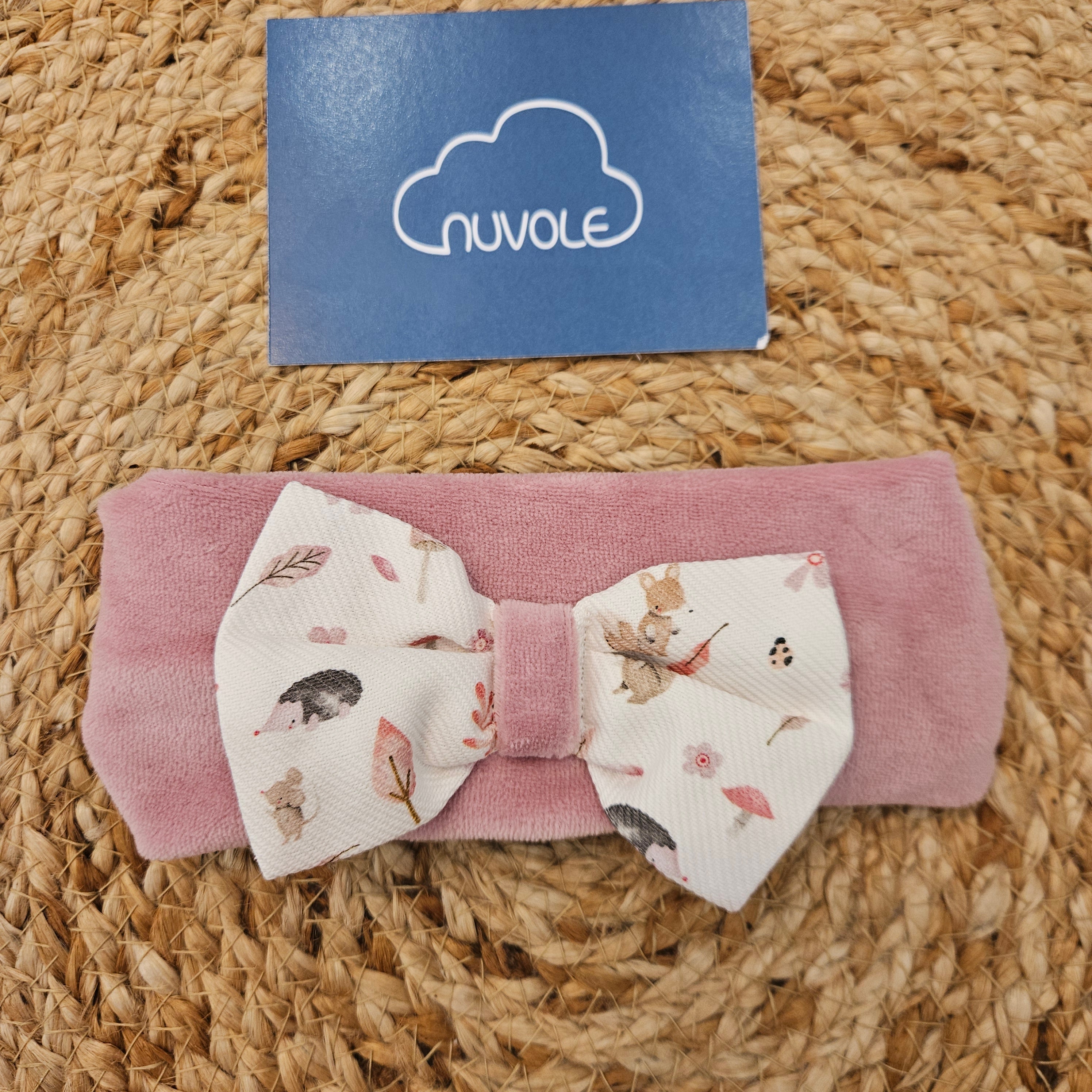 Fascia in ciniglia bianca con fiocco fantasia floreale.