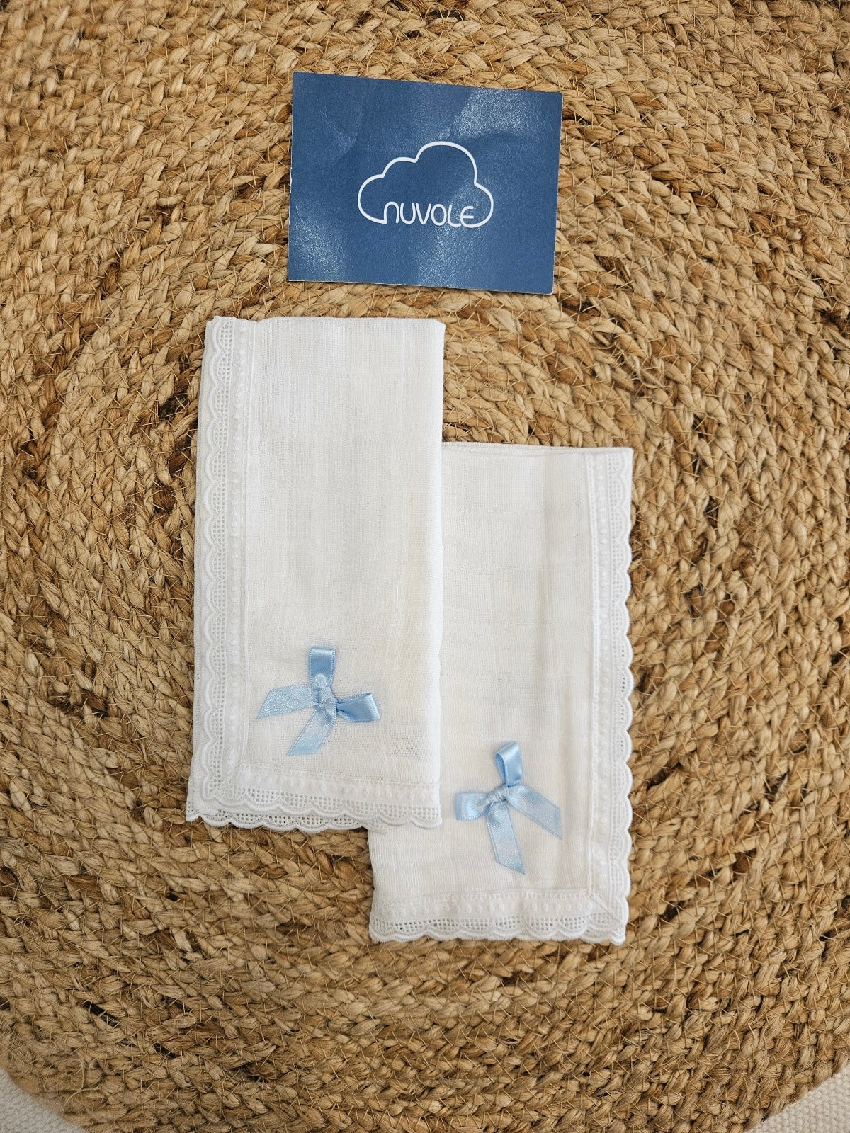 Confezione da 2 quadrotti in garza di cotone con bordatura merlettata e fiocco in raso rosa