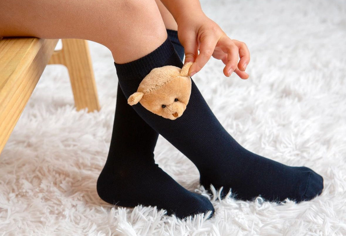 Calzini in cotone monocolore, orlo elasticizzato a costine ed orsetto in tessuto applicato sul lato superiore