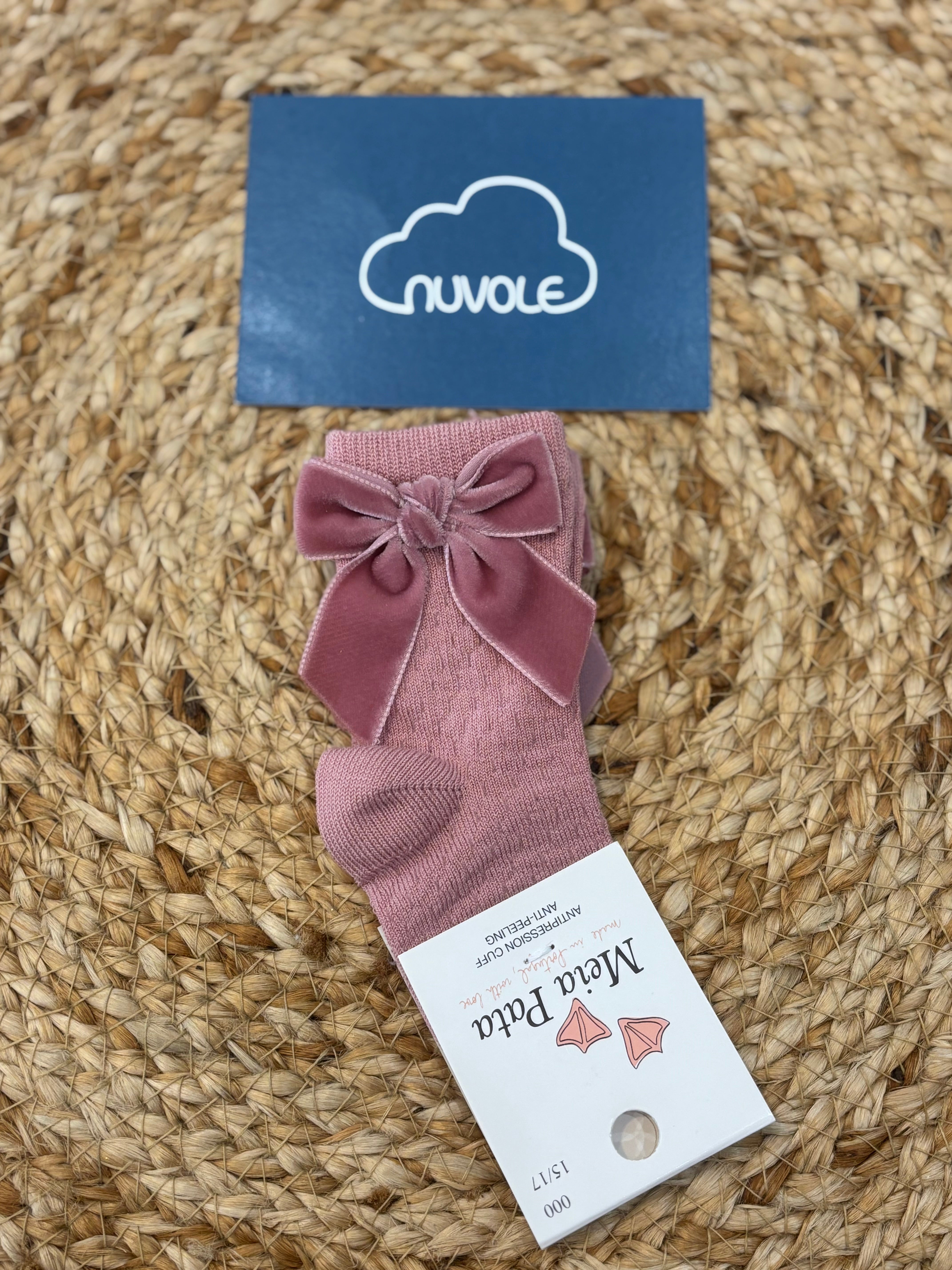 Calzino lungo con lavorazione effetto mini traforo e fiocco in velluto in tono applicato