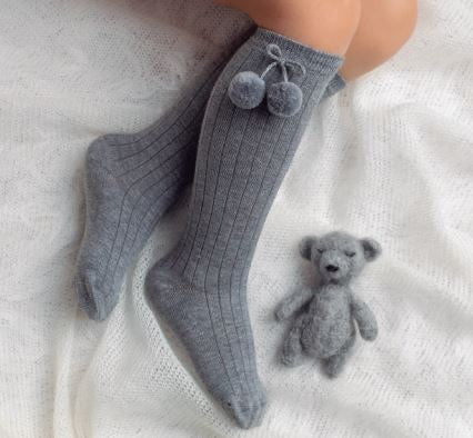 Calzini in cotone rigato monocolore, orlo elasticizzato a costine e pompon