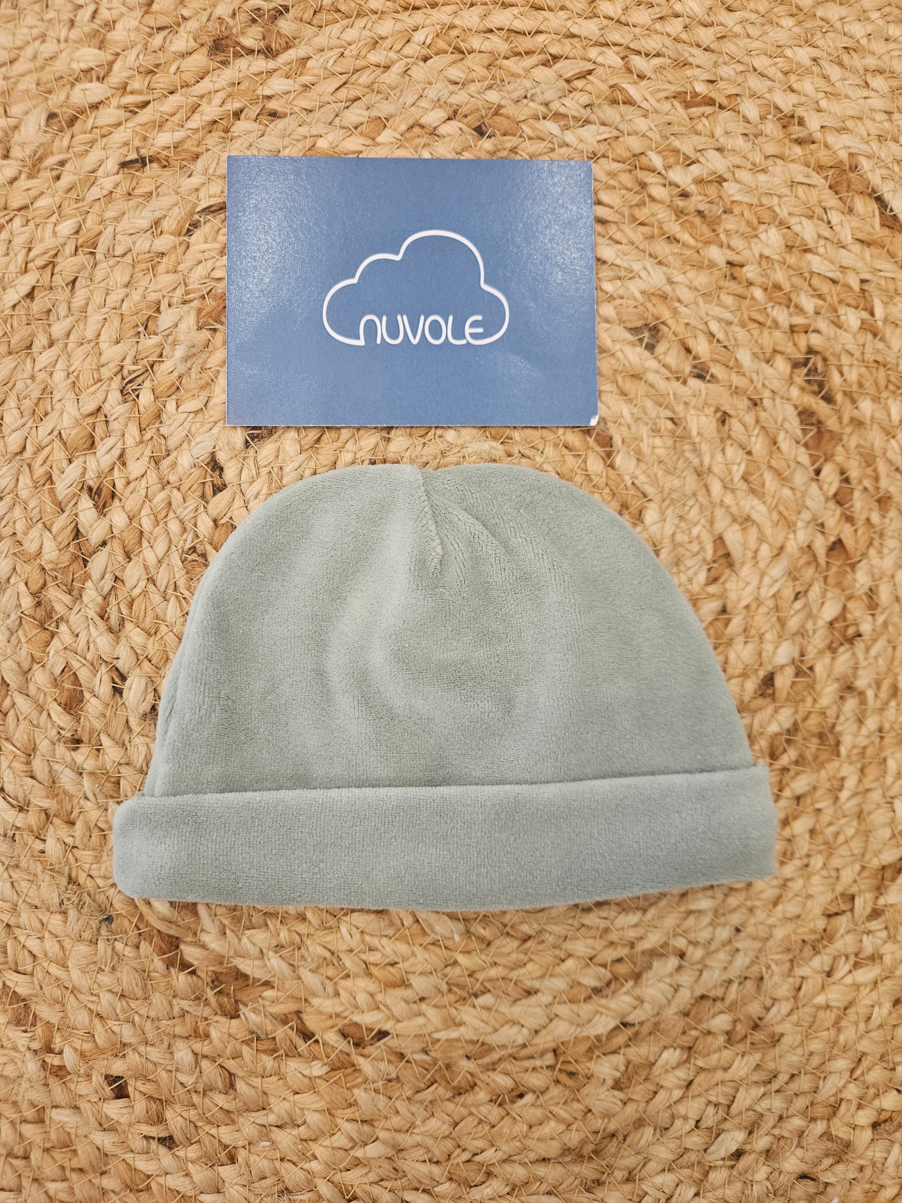 Cappellino in ciniglia verde salvia con fiocco fantasia
