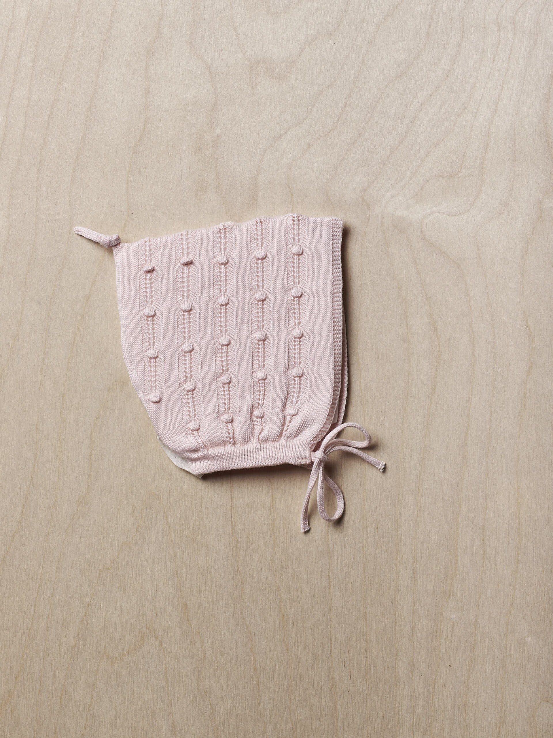 Cuffia corallo lavorata a maglia fine in cotone organico morbido e traspirante. Ha un nastro da annodare sotto il mento.