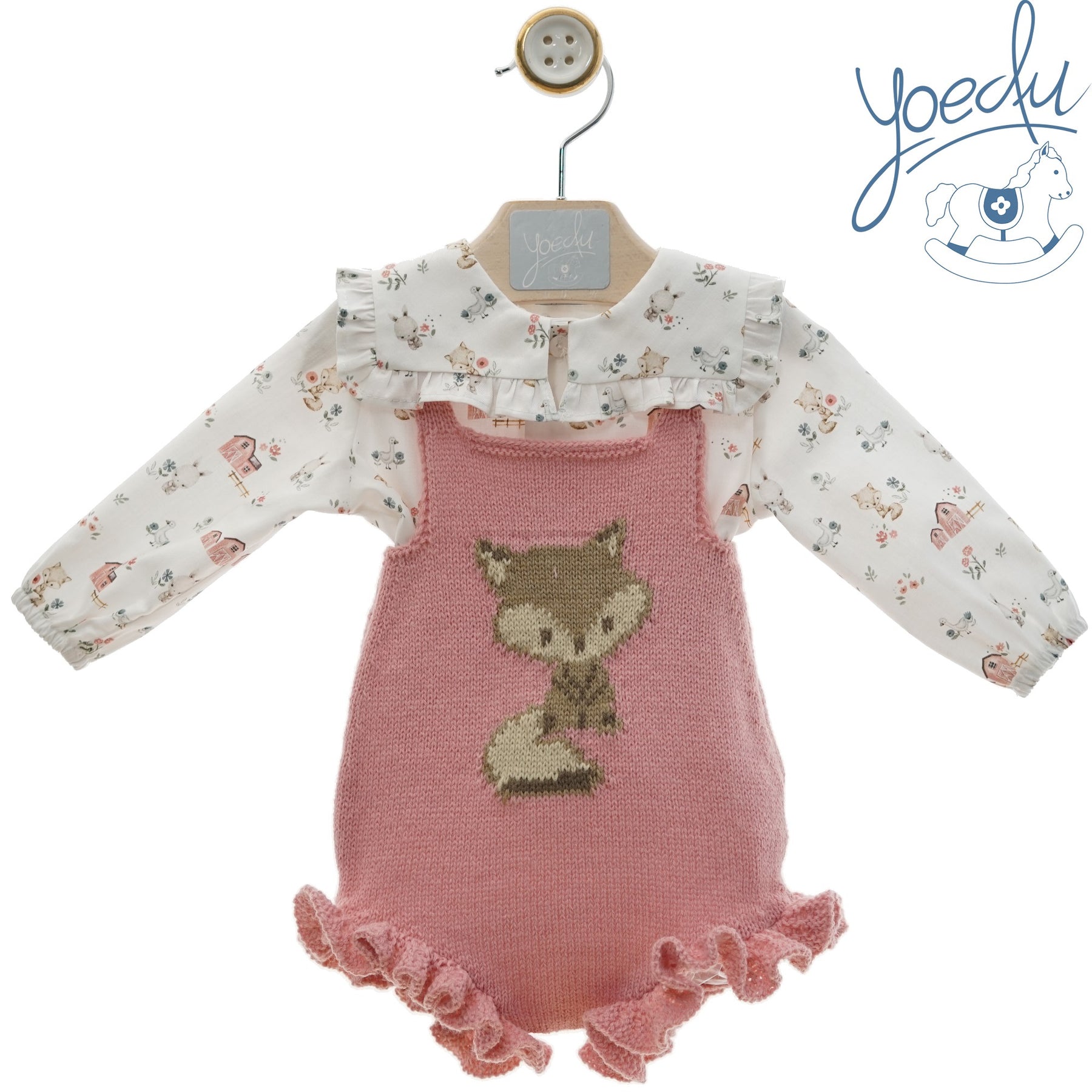 Completo composto da pagliaccetto in maglia con disegno volpe jacquard e camicia in cotone stampato con collettone. La camicia si abbottona sul davanti con bottoni in madreperla.