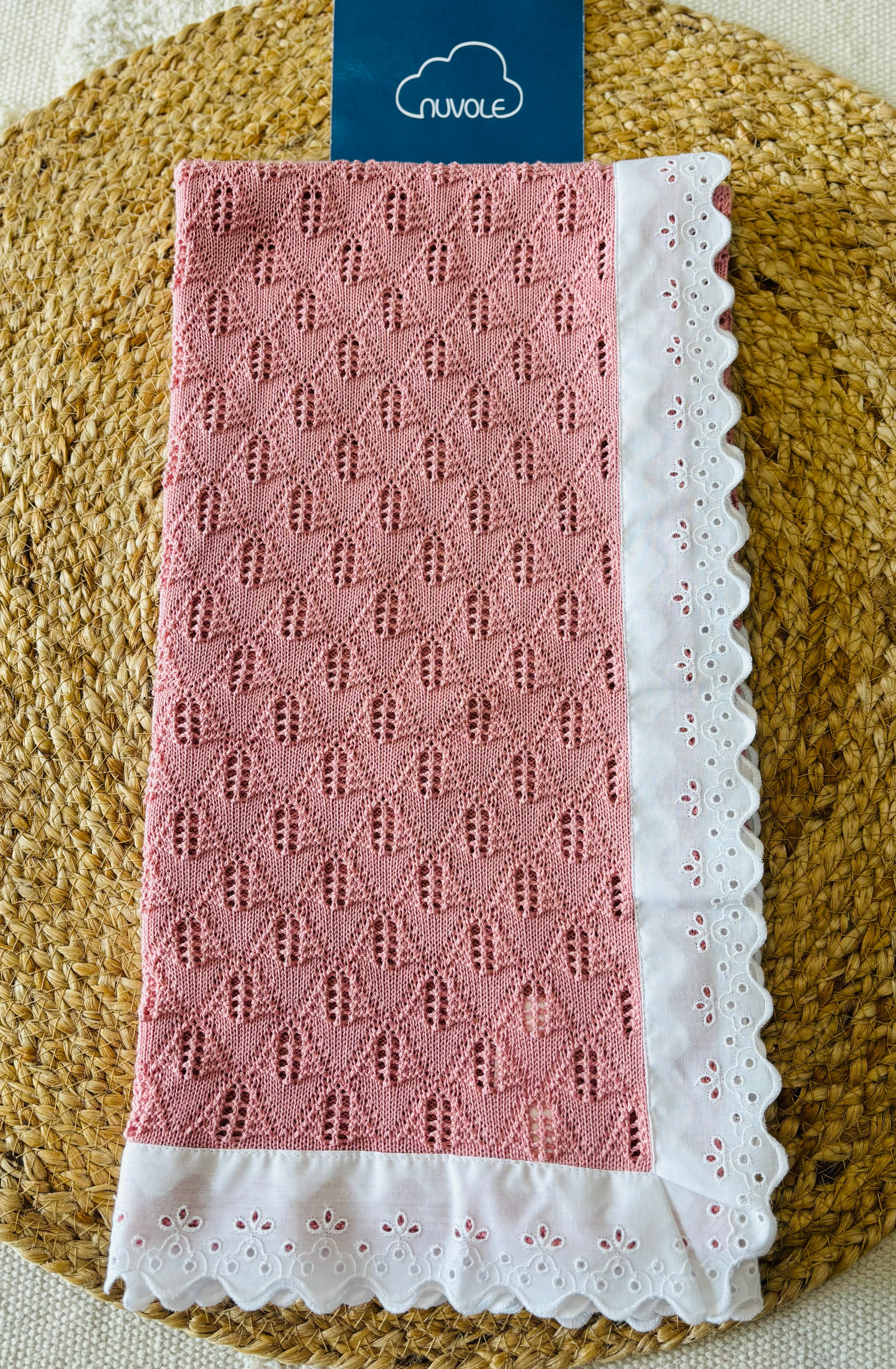 Coperta in filo di cotone lavorata con passamaneria in pizzo sangallo colore bianco