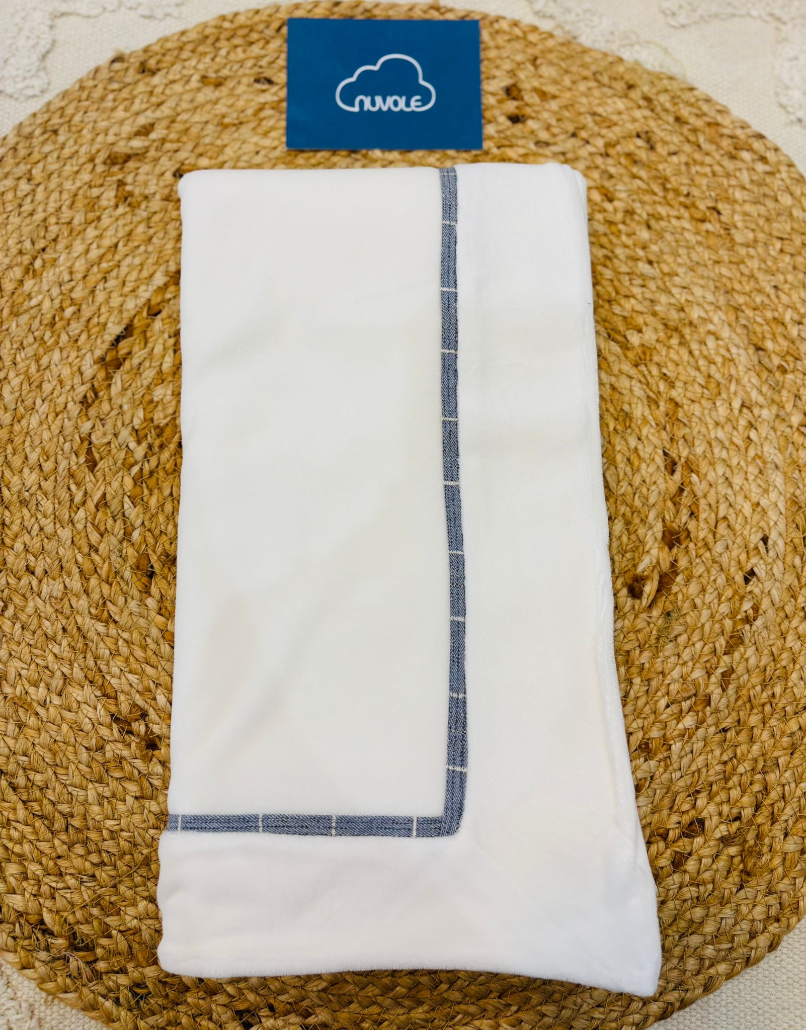 Copertina bianca realizzata in morbida calda ciniglia e caratterizzata da un grazioso contorno in tessuto fantasia e dai toni del rosa antico. Da utilizzare sia nel porta enfant che come scialle per avvolgere il neonato.