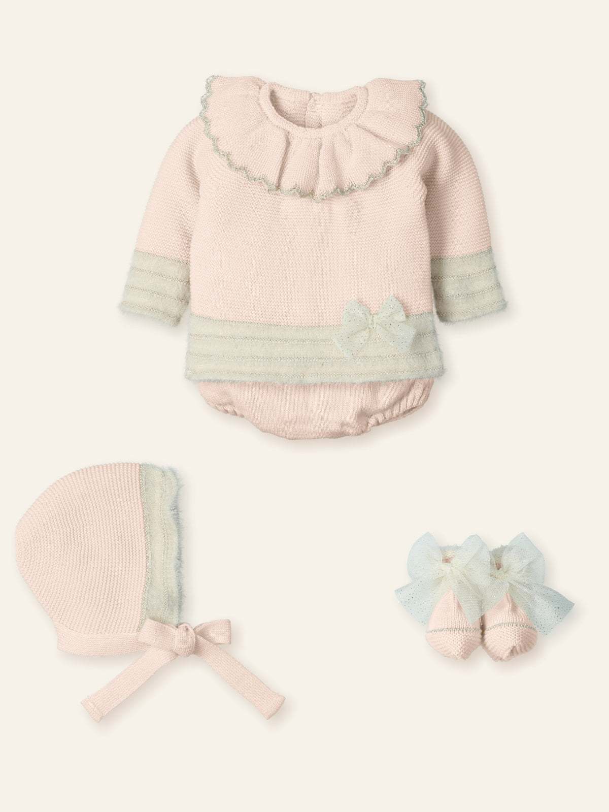 Set nascita con decorazione su maglietta e abbottonatura sul retro con bottoni in madreperla. presenta cappellino e ghettina in coordinato