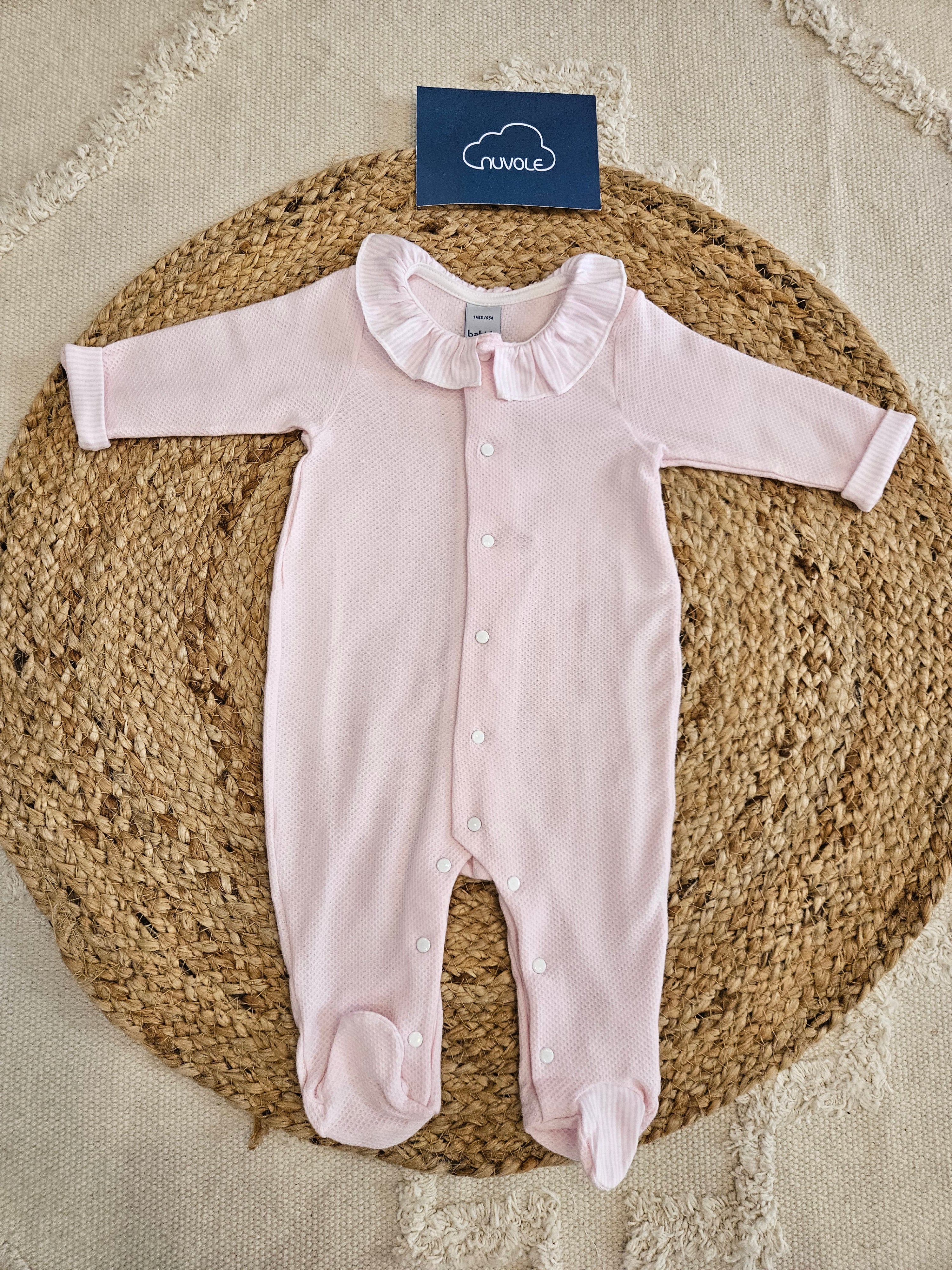 Tutina in piquet di cotone rosa con corpetto che presenta una lavorazione punto smock e collettone. Abbottonatura sul davanti e in basso per facilitare il cambio del pannolino.