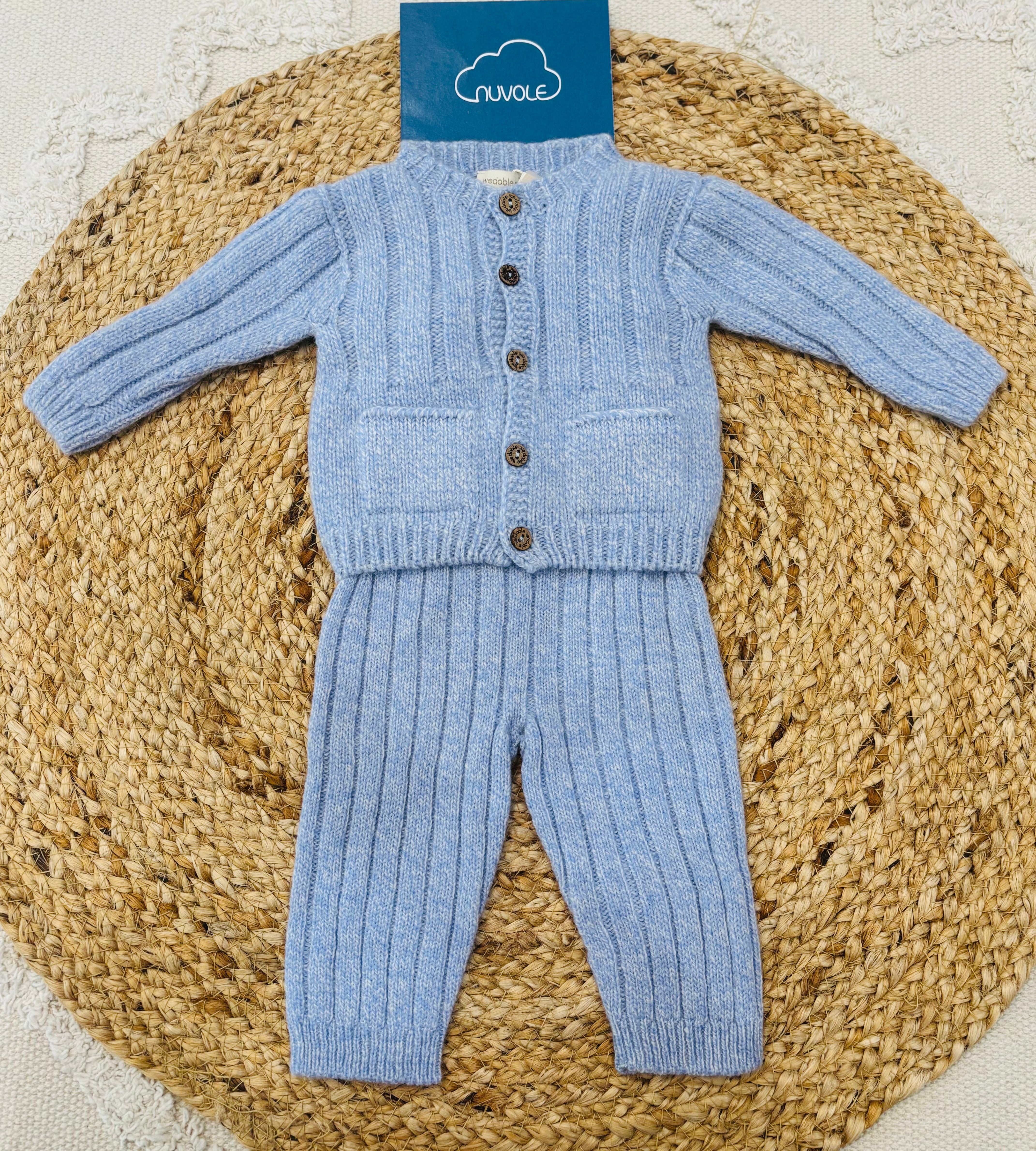 Morbido set nascita in misto lana con lavorazione trecce e colletto in cotone ricamato. Abbottonatura sul retro con bottoni in madreperla. Ghettina e cappello in coordinato.