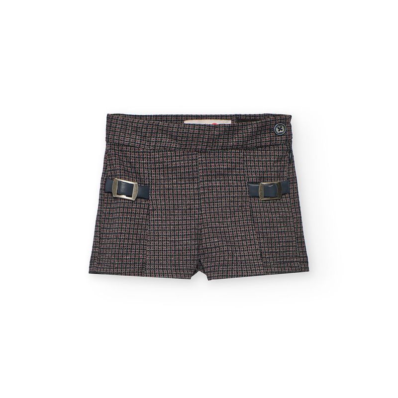 Mini gonna a portafoglio in pie de poule con bottoni in velluto bordeaux. Elastico centro dietro