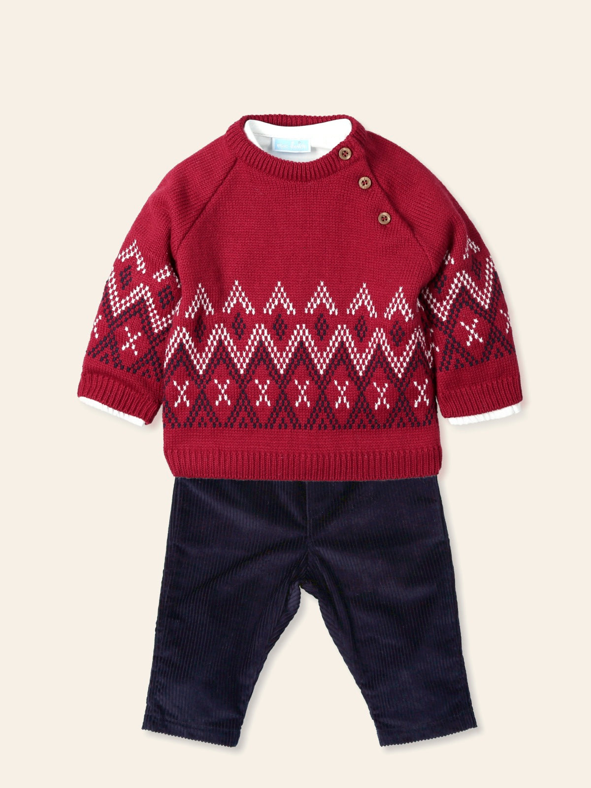 Set nascita in lana colore blu, composto da maglia con disegno renna in lavorazione jacquard, ghettina e cappello con pompon