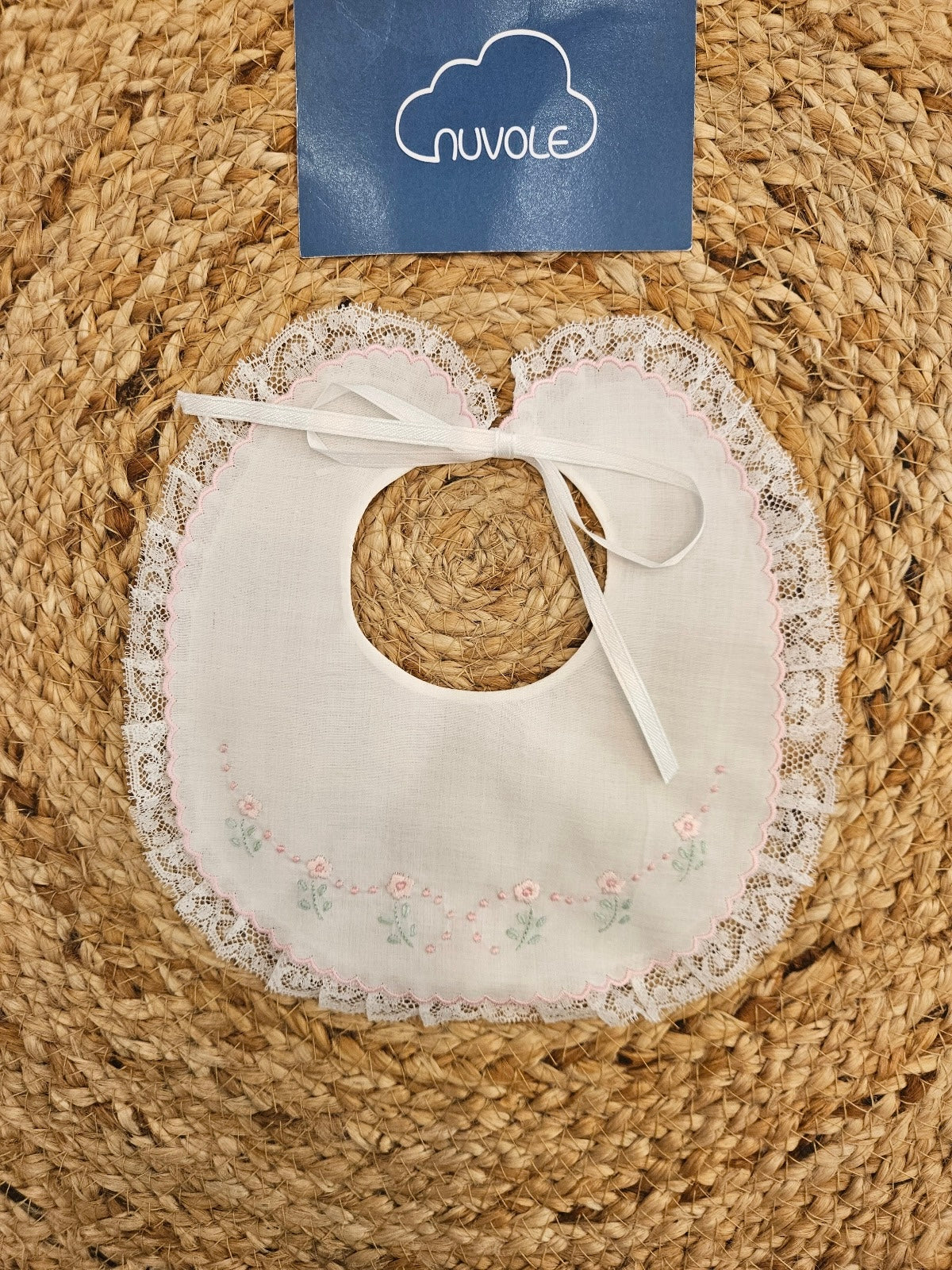 Elegante bavaglino ricamato a mano in batista di cotone e inserto in pizzo.