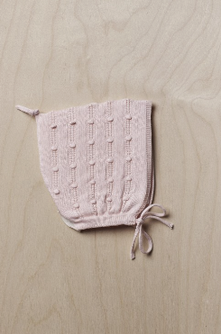 Cuffietta di cotone organico morbido e traspirante di color rosa con ricamo e laccetti laterali.