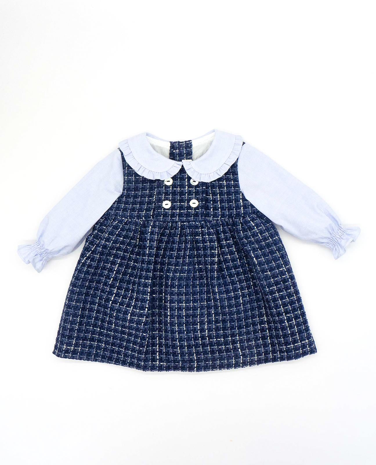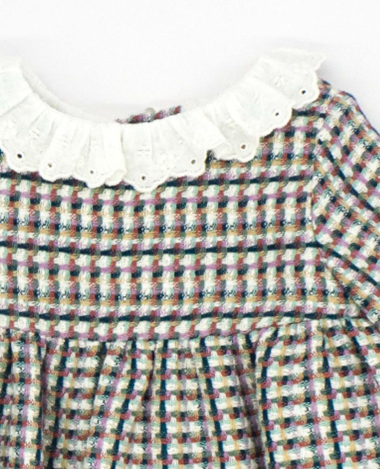 Raffinato abito in tessuto chanel multicolor e colletto in cotone ricamato bianco. Abbottonatura sul retro con bottoni in madreperla. Foderato