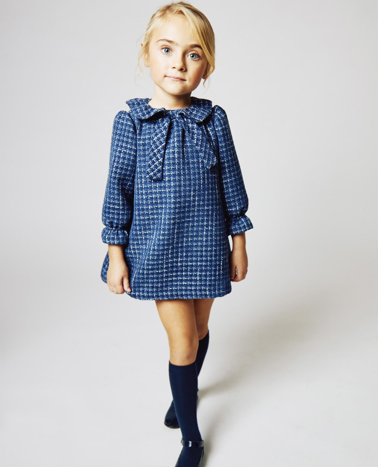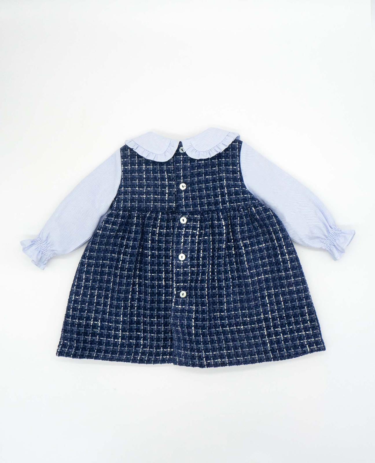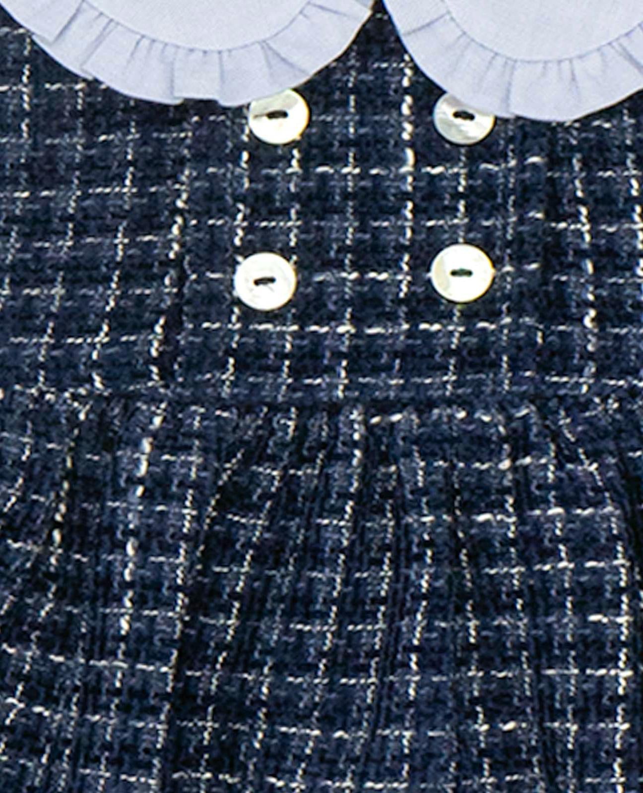 Raffinato abito effetto finta camicia con colletto baby e bottoni in madreperla. Tessuto chanel blu foderato