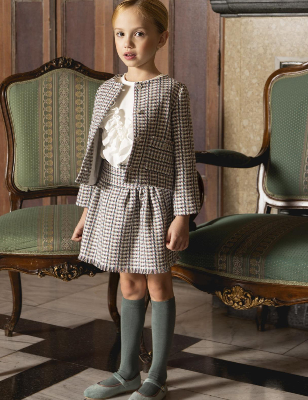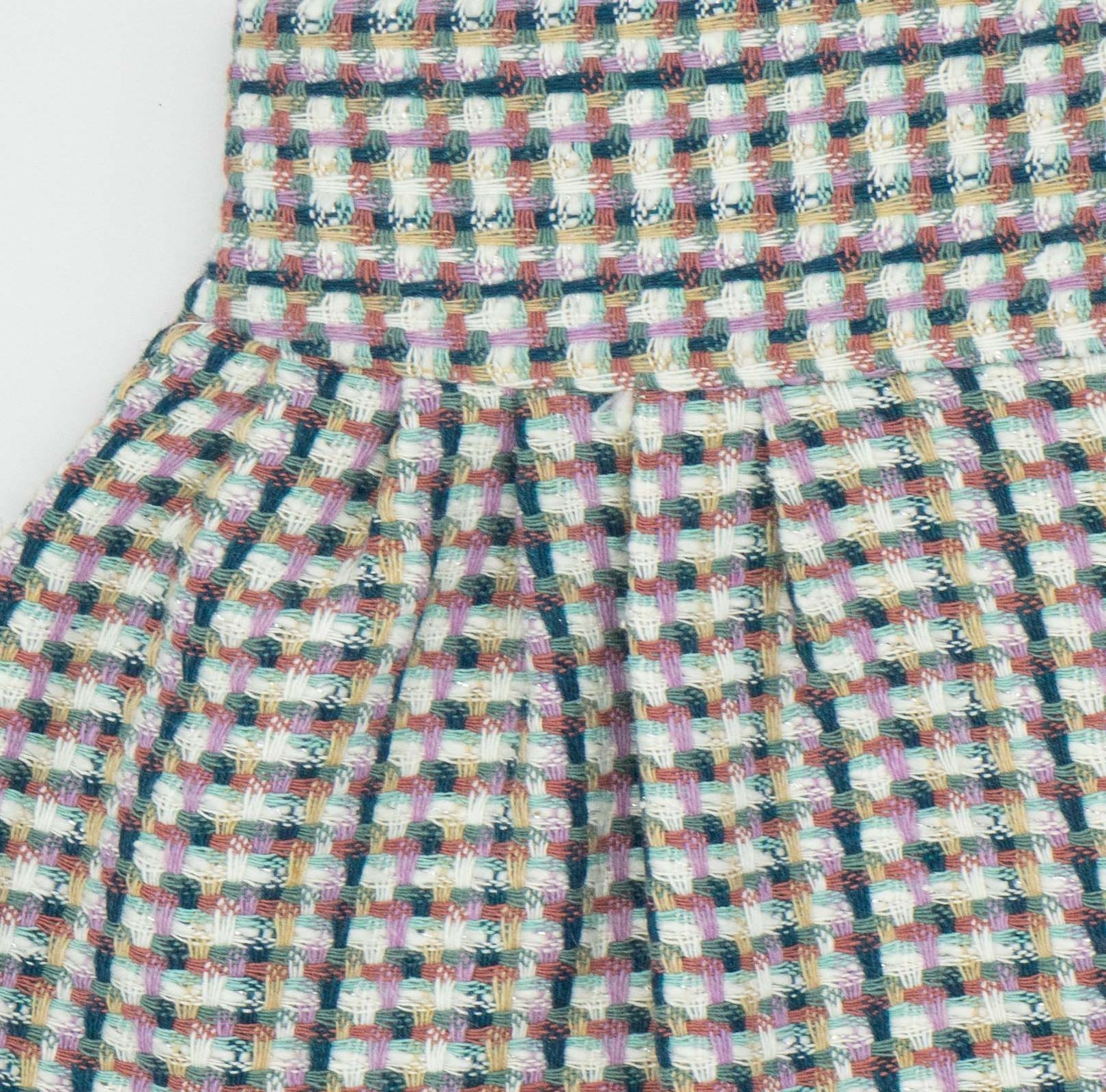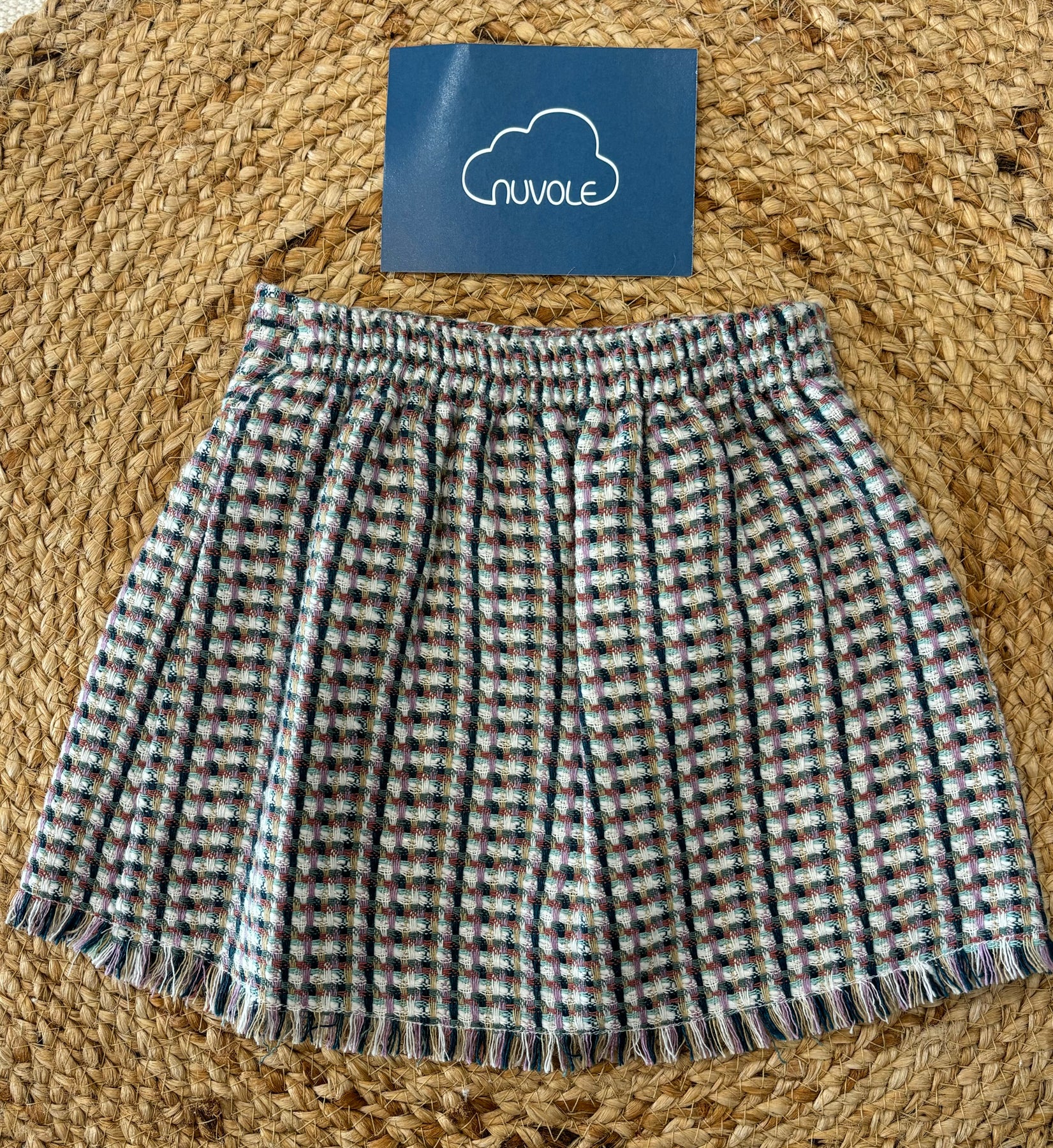 Raffinata gonna in tessuto chanel multicolor, sfrangiata al fondo e con elastico interno sul dietro. Foderata