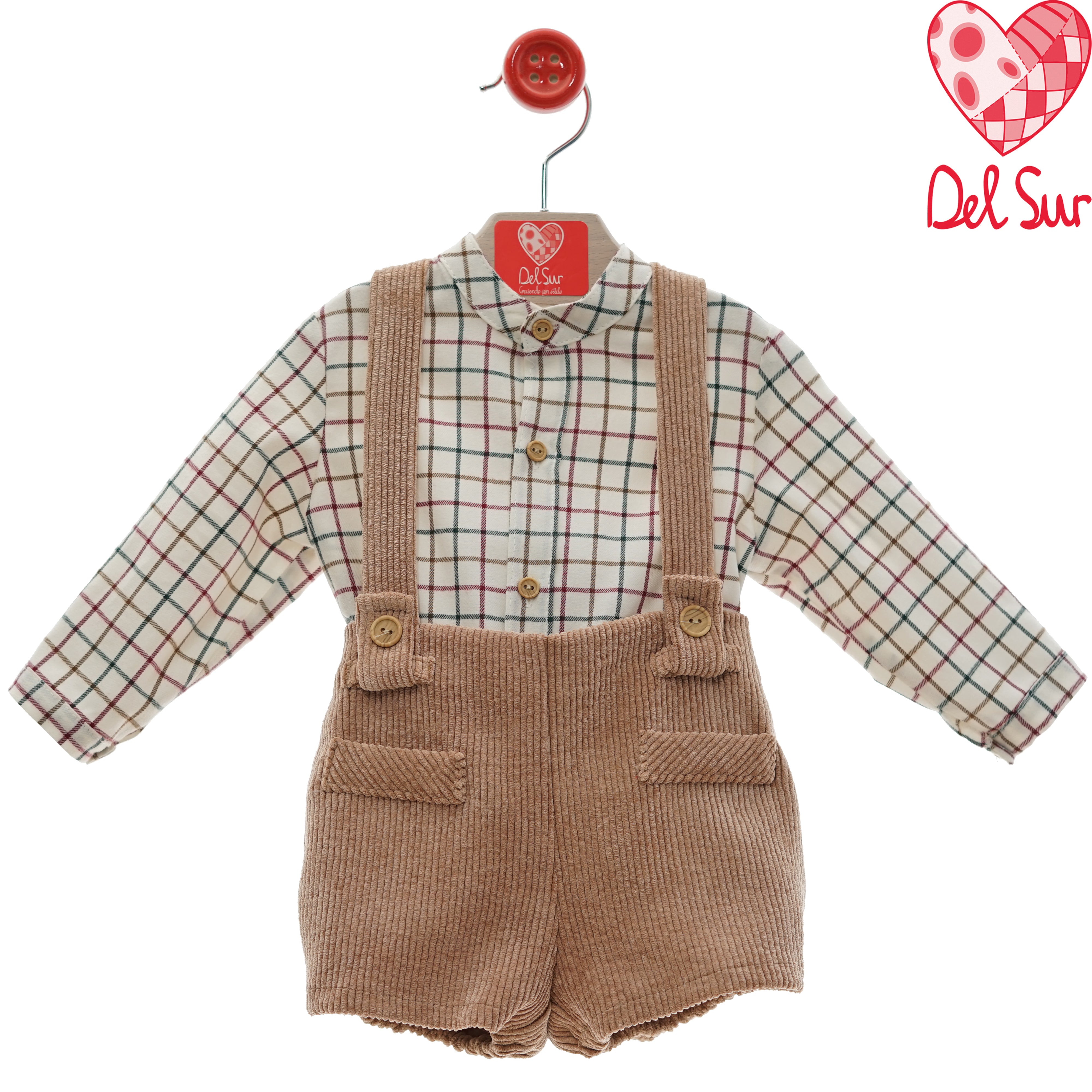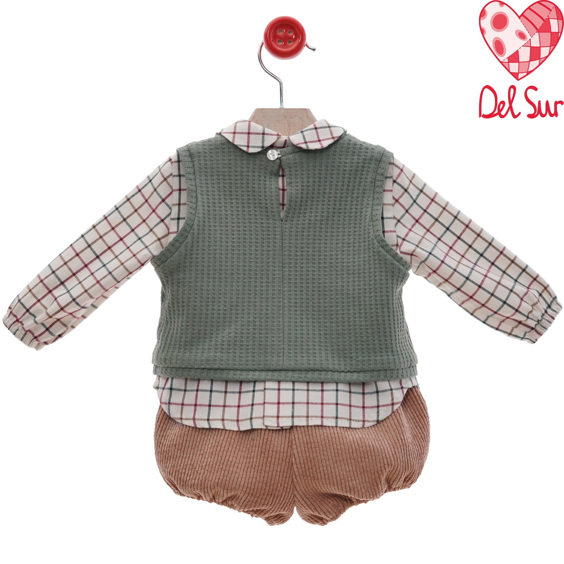 Completo 3 pezzi composto da camicia a quadri su base bianca, gilet tessuto waffel colore verde salvia e pantaloncino modello culotte in velluto rocciatore beige. La camicia si abbottona sul retro con bottoni in madreperla.