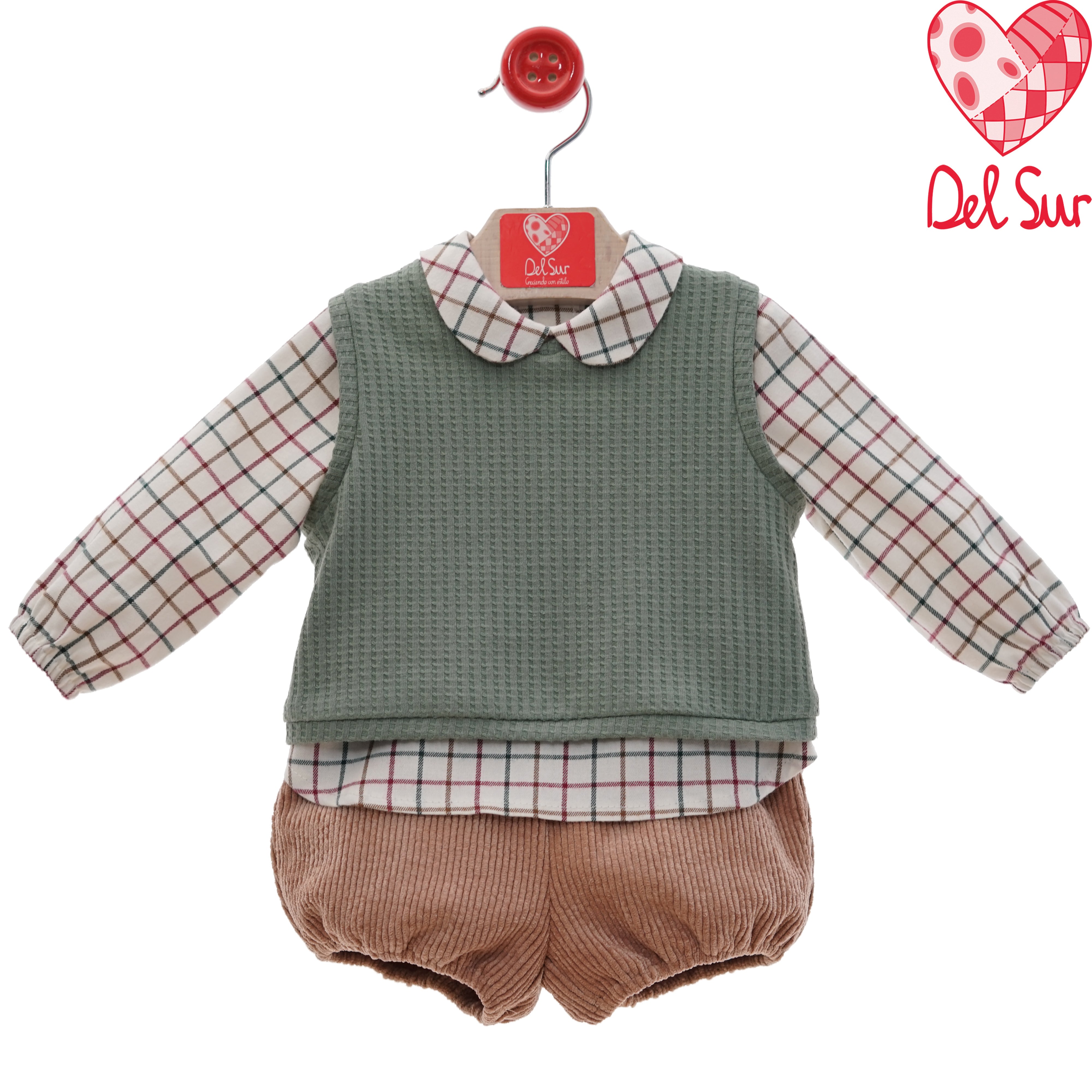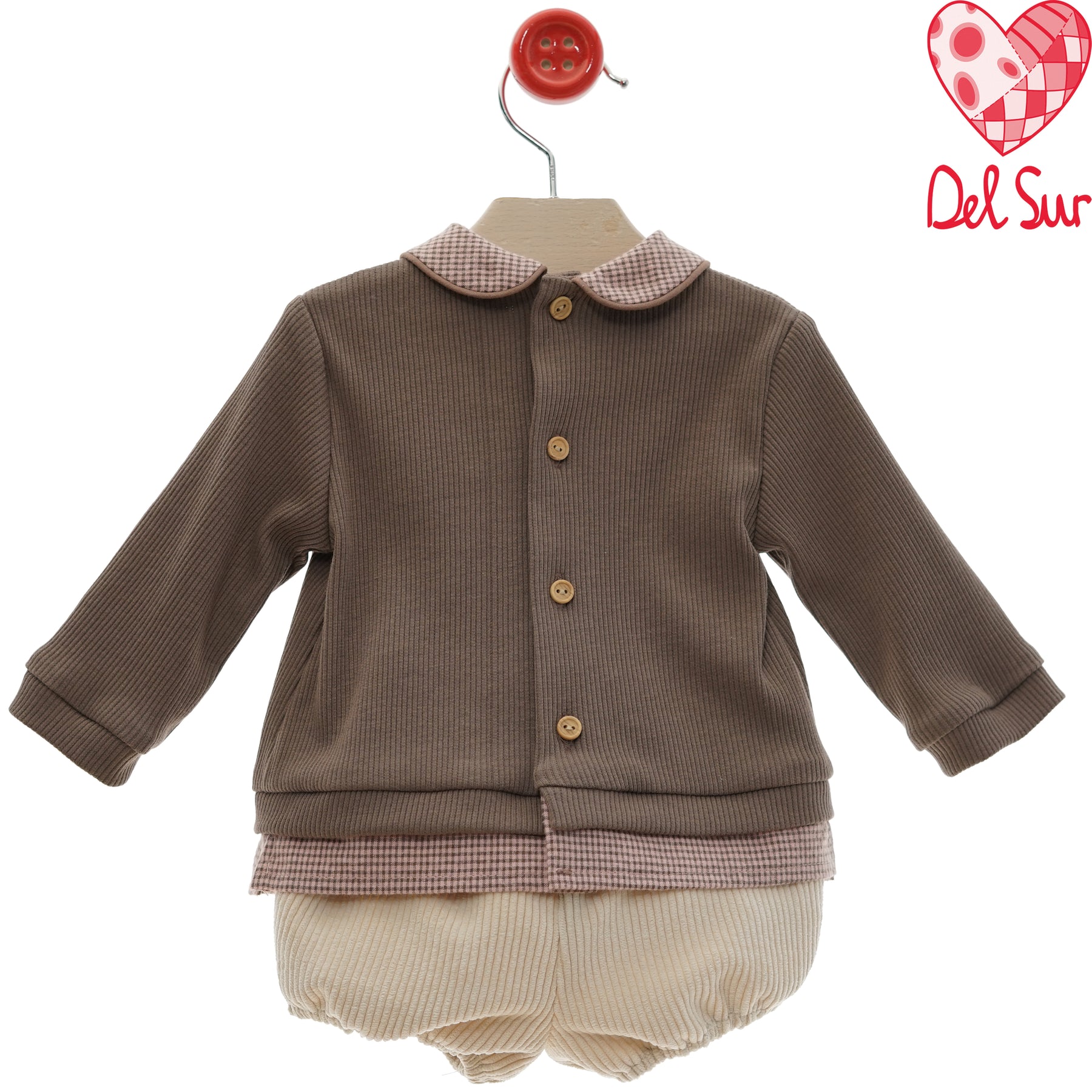 Completo composto da maglia con finta camicia a quadretti e pantaloncino modello culotte in velluto rocciatore beige. La maglia si abbottona sul retro con bottoni effetto legno.