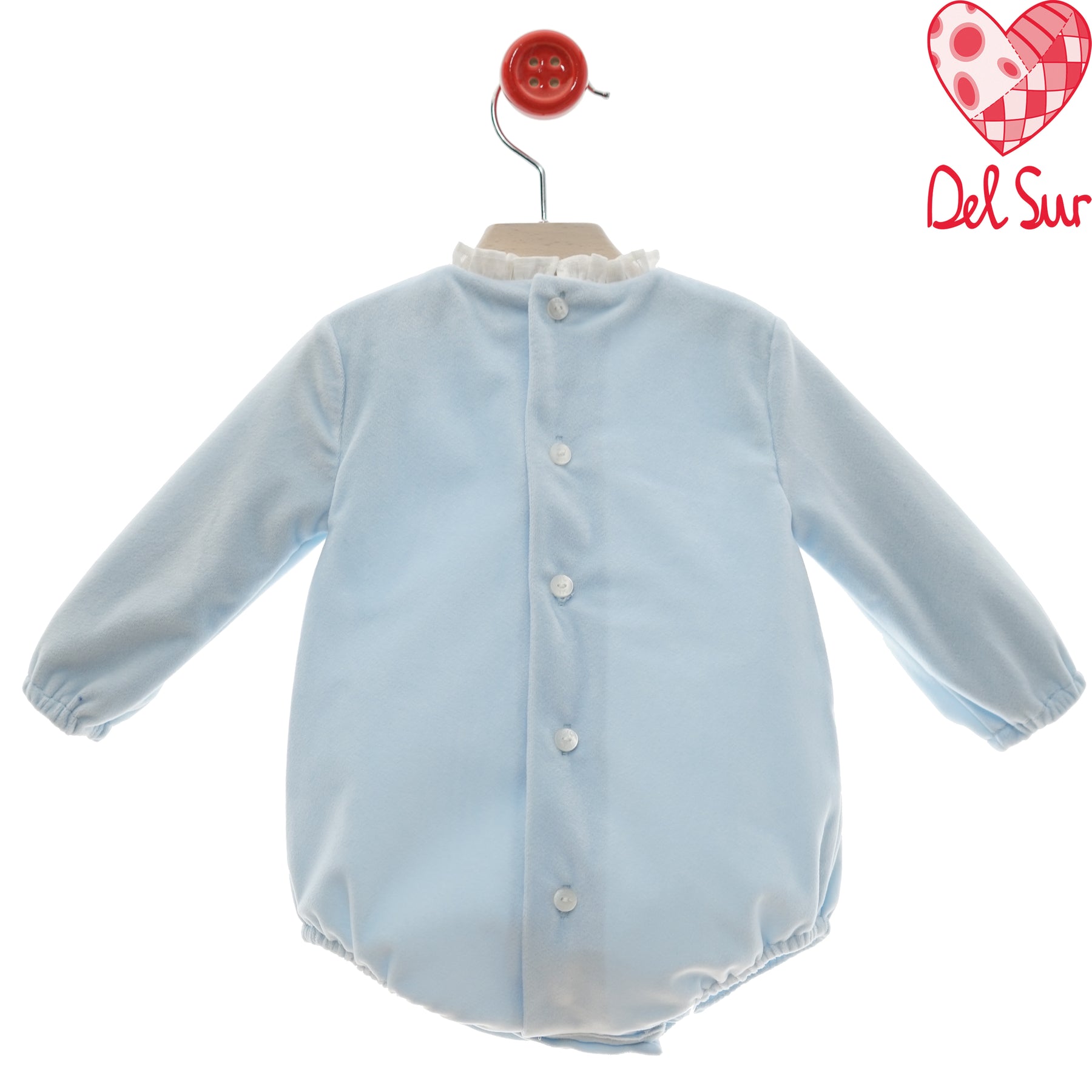 Pagliaccetto in velluto celeste con volant al collo . Foderato. Abbottonatura sul retro con bottoni in madreperla e apertura al fondo per il cambio del pannolino