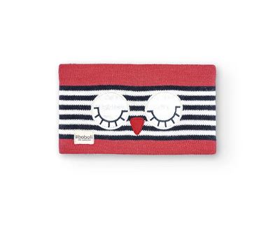 Girocollo in maglia a treccia per bambino a pois antracite e sfondo rosso. È foderato con pelliccia morbida di colore antracite. La decorazione è un ricamo in feltro e un'etichetta con dettaglio del marchio. Taglie disponibili XXS, XS, S e M.