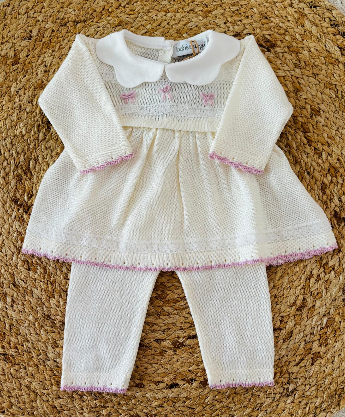 SET NASCITA IN LANA, COLORE ROSA CHIARO(VINTAGE), COMPOSTO DA MAGLIETTA, GHETTINA E CUFFIETTA.