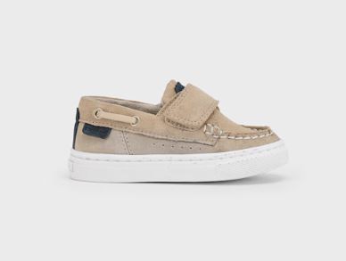 Scarpa modello nautico in denim con chiusura a strappo e cuciture a vista. Suola interna in cotone e tomaia in gomma antiscivolo.