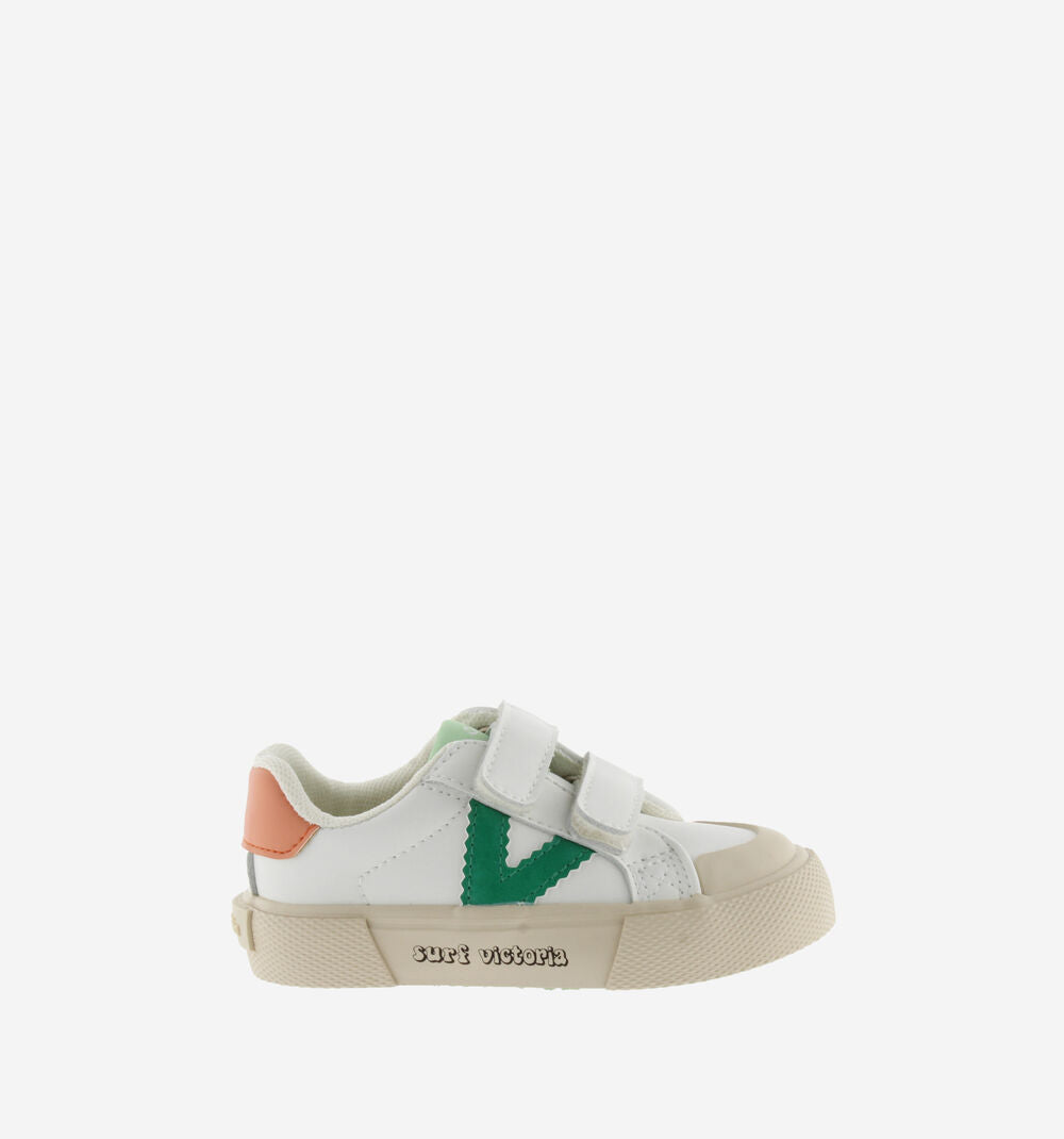 Sneakers sportive bianche per bambini con dettagli colorati su logo, etichetta e parte posteriore. Chiusura con due fascette a strappo che garantiscono un miglior sostegno e sono più facile da indossare. Suola marrone e punta in gomma per garantire resistenza e durata. Dotate di soletta ad alta densità per un maggiore comfort.