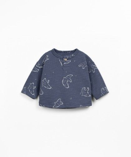 T-shirt stampata in maglina di cotone. Abbottonatura davanti con bottoni in noce di cocco.