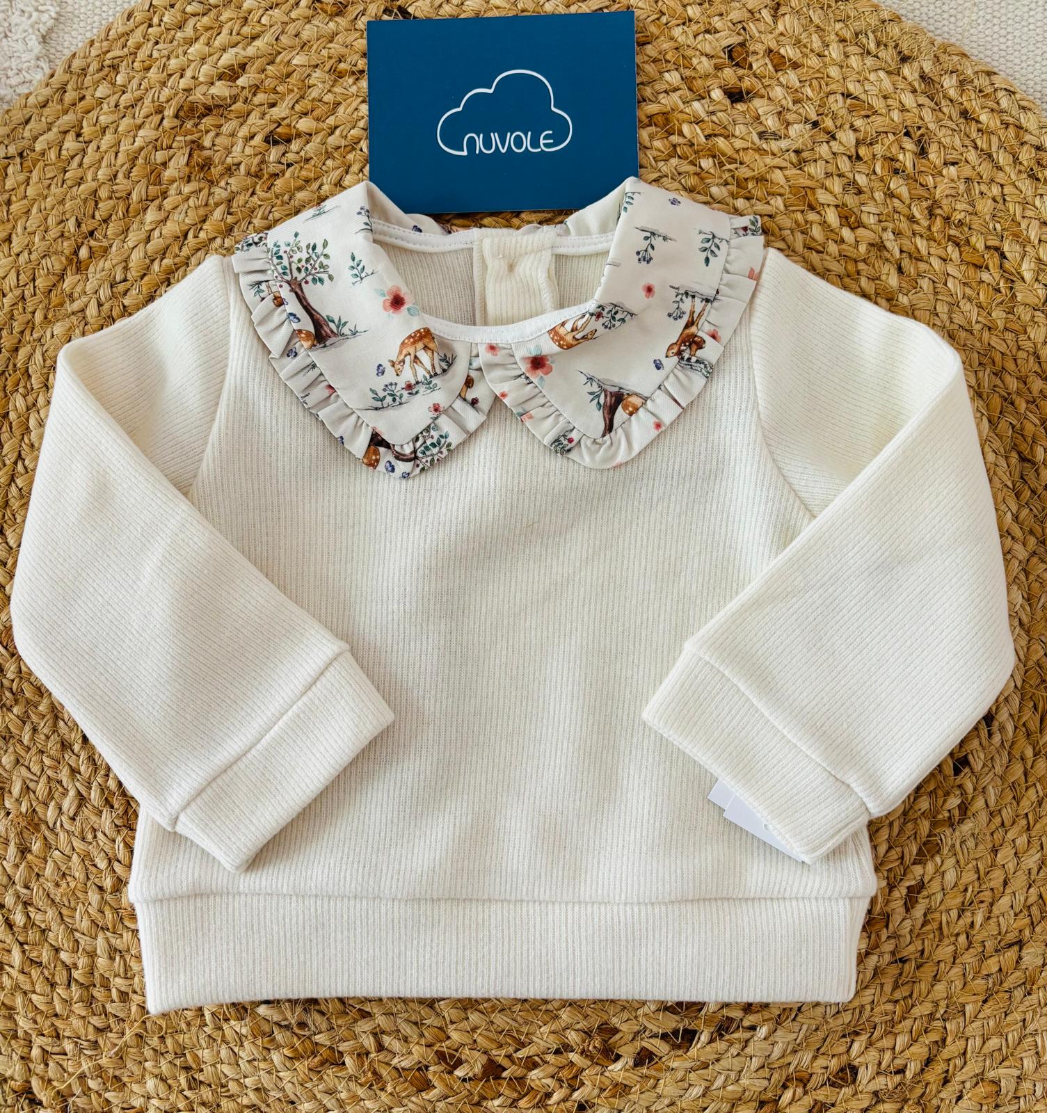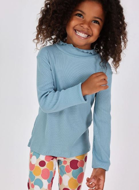 Maglietta di cotone per bambina, di colore verde acqua, ideale per i climi più freschi. Disegnata con un elegante collo rotondo adornato da un delicato volant e maniche lunghe, offre comfort e adattabilità. Realizzata con materiali di alta qualità. La sua versatilità permette di abbinarla facilmente con pantaloni o gonne, risultando perfetta per occasioni sia informali che formali. Un'aggiunta essenziale al guardaroba autunnale e invernale, questa maglietta garantisce calore e stile