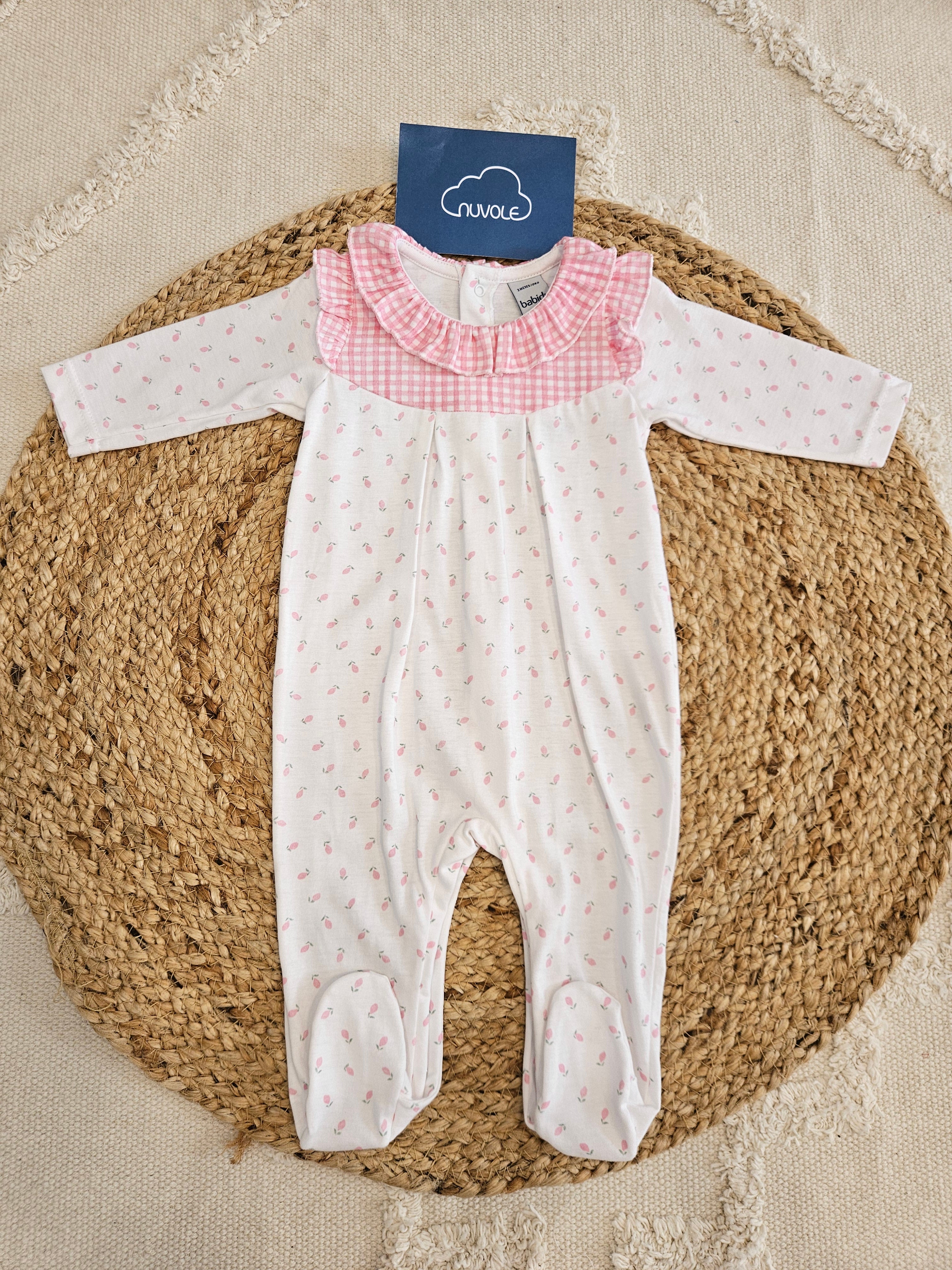 Tutina fondo bianco in cotone fantasia stelle maquillage.. Abbottonatura sul davanti e in basso per facilitare il cambio del pannolino.