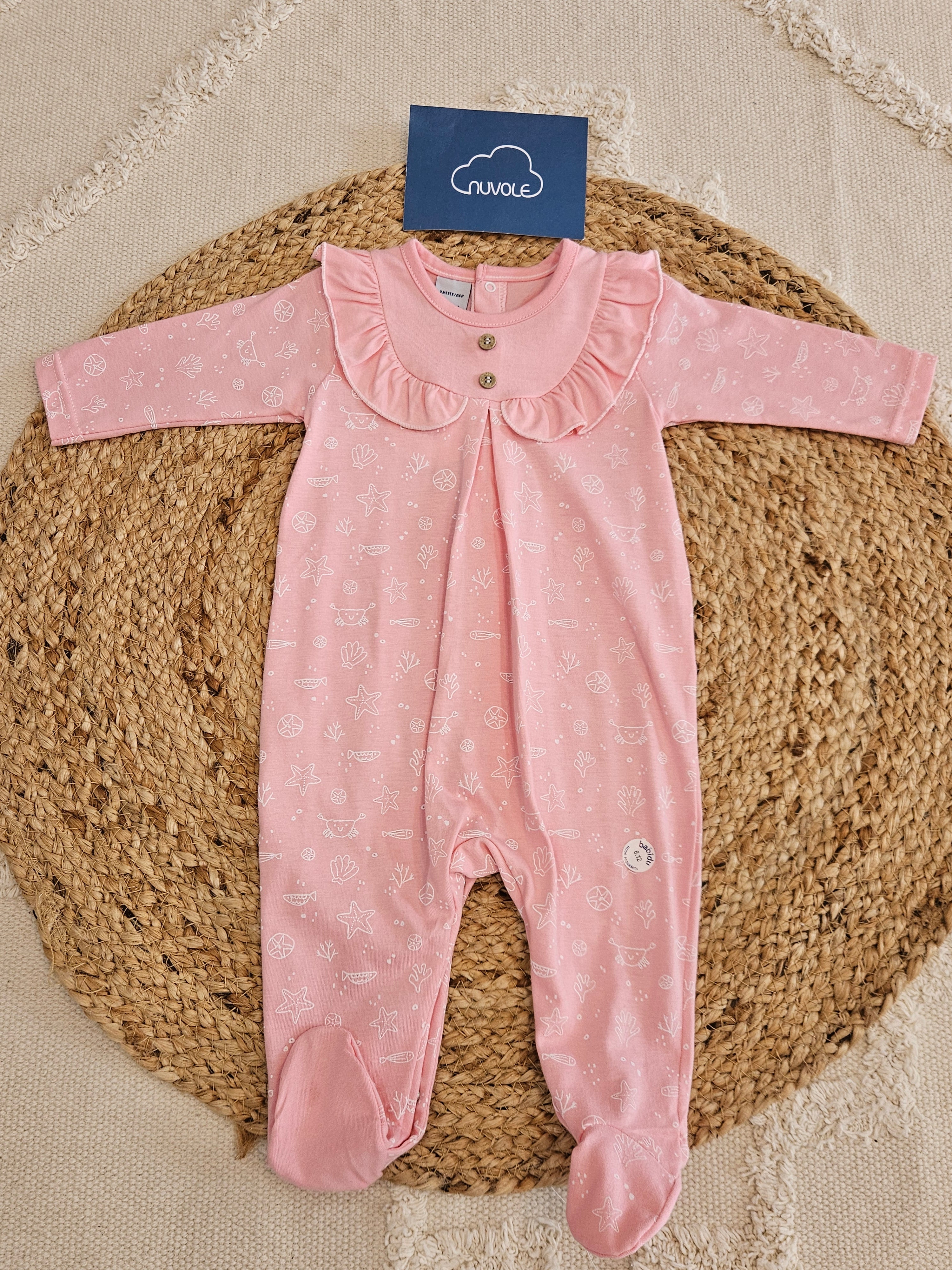 Tutina fondo bianco in cotone fantasia  fondo marino. Abbottonatura sul davanti e in basso per facilitare il cambio del pannolino.