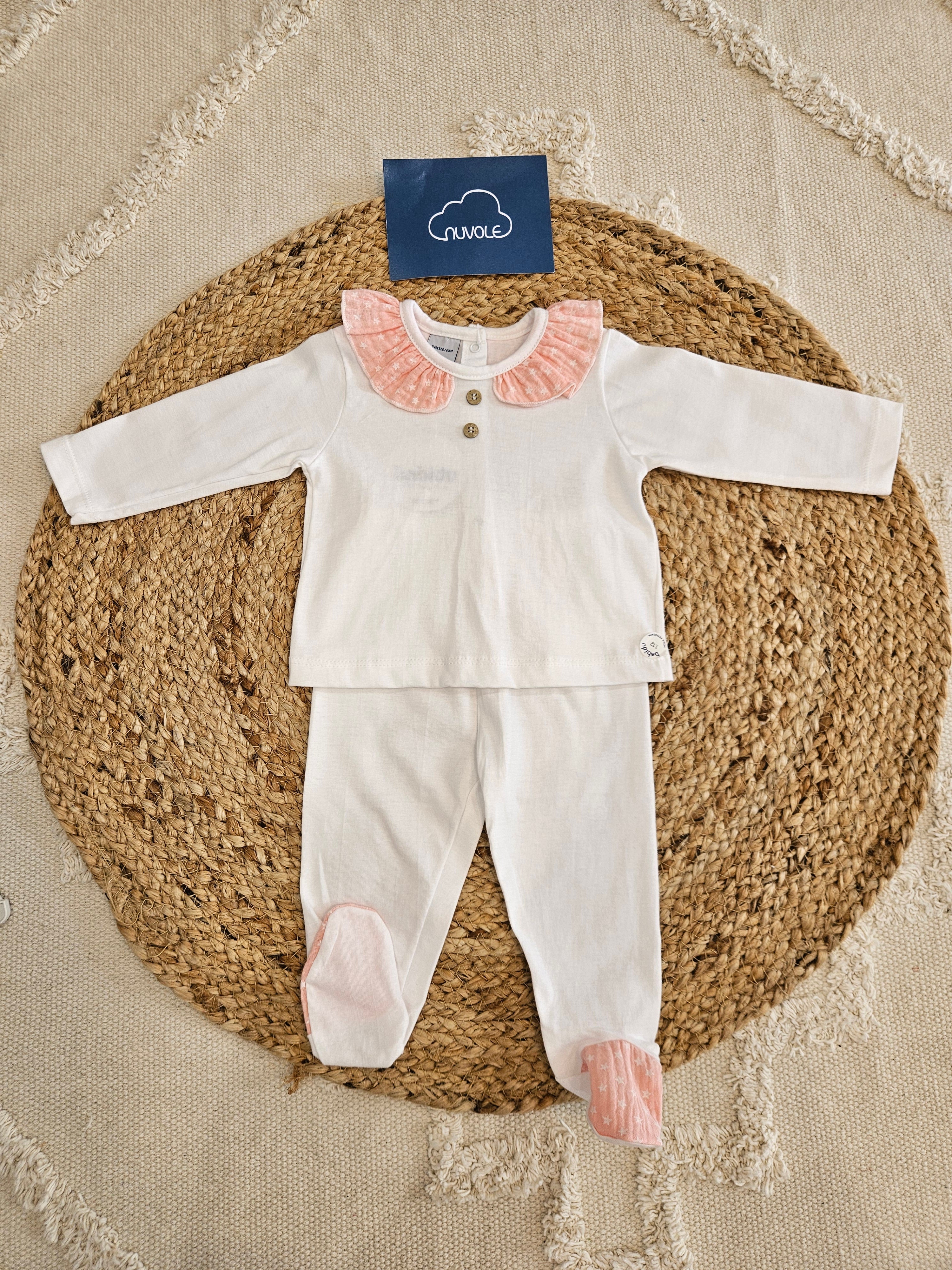Tutina fondo bianco in cotone fantasia con stampa pesciolil. Abbottonatura sul davanti e in basso per facilitare il cambio del pannolino.