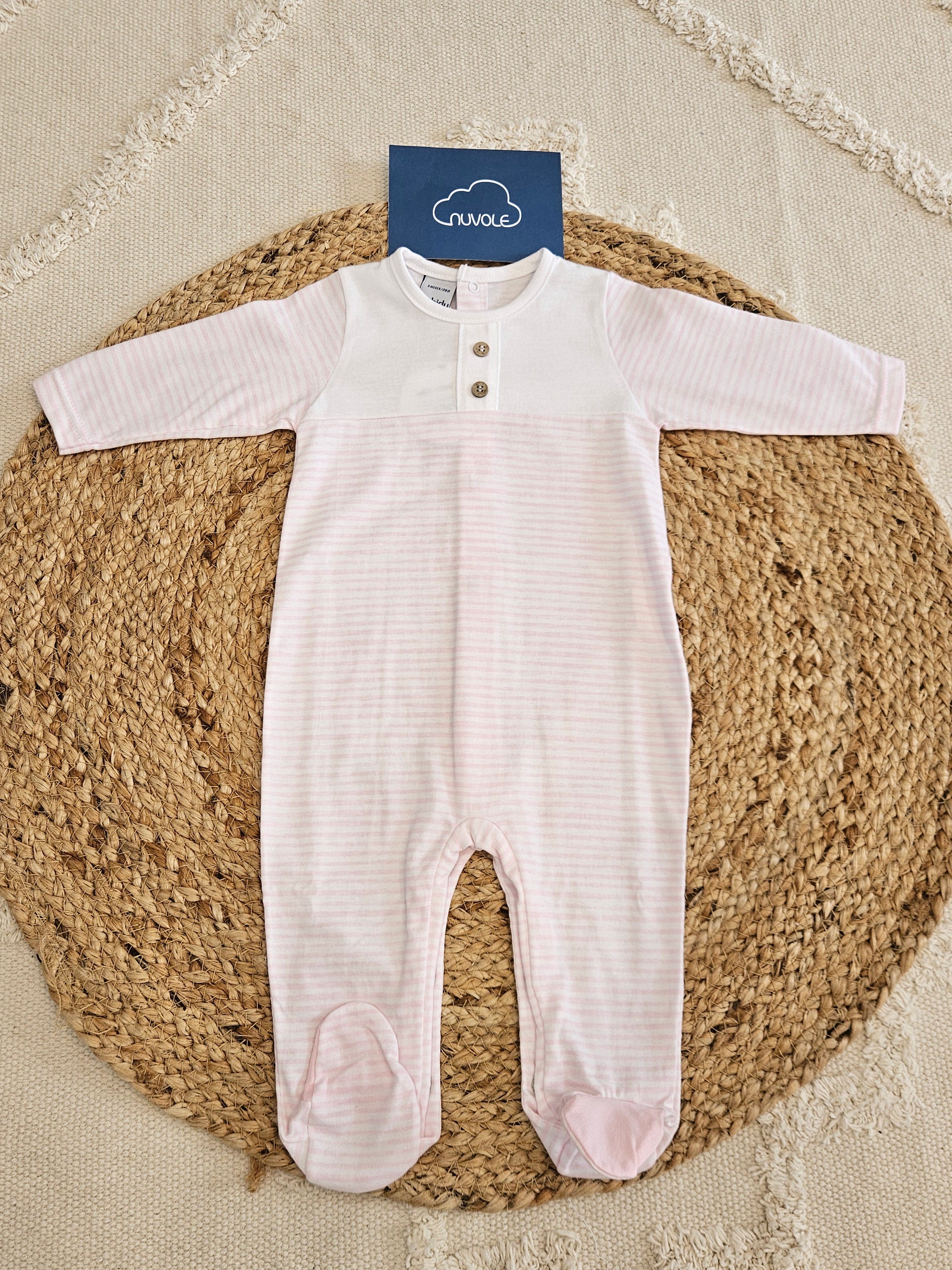 Tutina in piquet di cotone rosa con colletto in cotone stampato micro riga. Abbottonatura sul retro e in basso per facilitare il cambio del pannolino.
