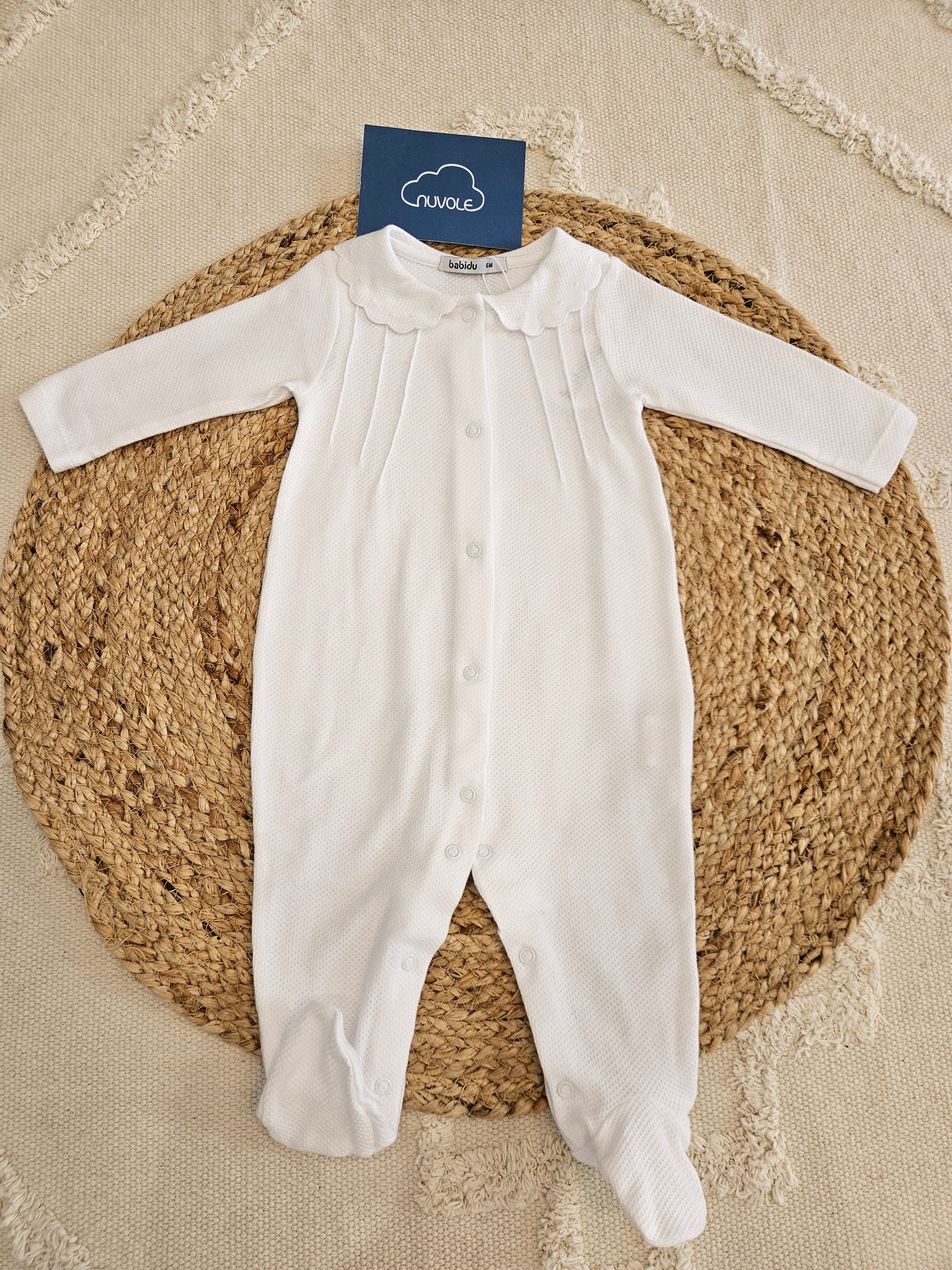 Tutina in piquet di cotone bianca con colletto e polsini grigi. Presenta sul corpetto lavorazione punto smock e applicazione di bottoncini in madreperla. Abbottonatura sul retro e in basso per facilitare il cambio del pannolino.