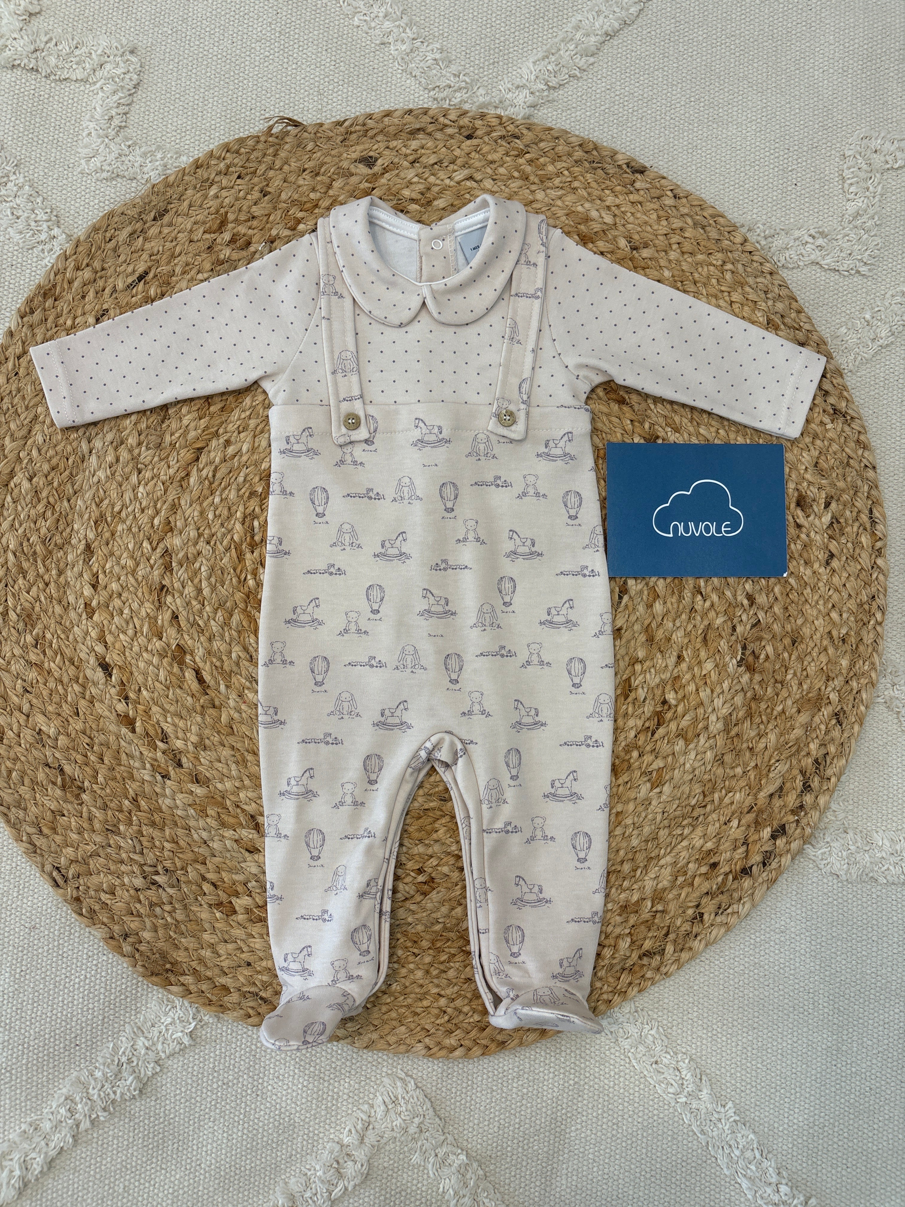 Tutina intera in caldo cotone in rosa antico e colletto a forma di petali in fantasia presente anche sul piedino. Abbottonatura sul centro dietro e e in basso per facilitare il cambio del pannolino.