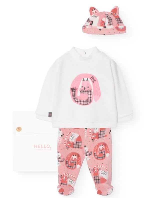Tutina in ciniglia verde salvia con colletto fantasia, abbottonatura sul retro e pratica apertura al fondo per il cambio del pannolino.