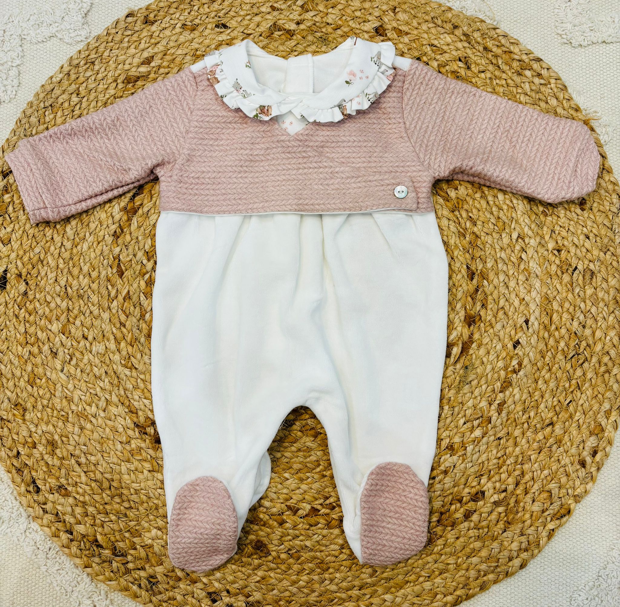 Morbida tutina in ciniglia con volant in cotone fantasia. Pratica apertura con bottoni a clip.