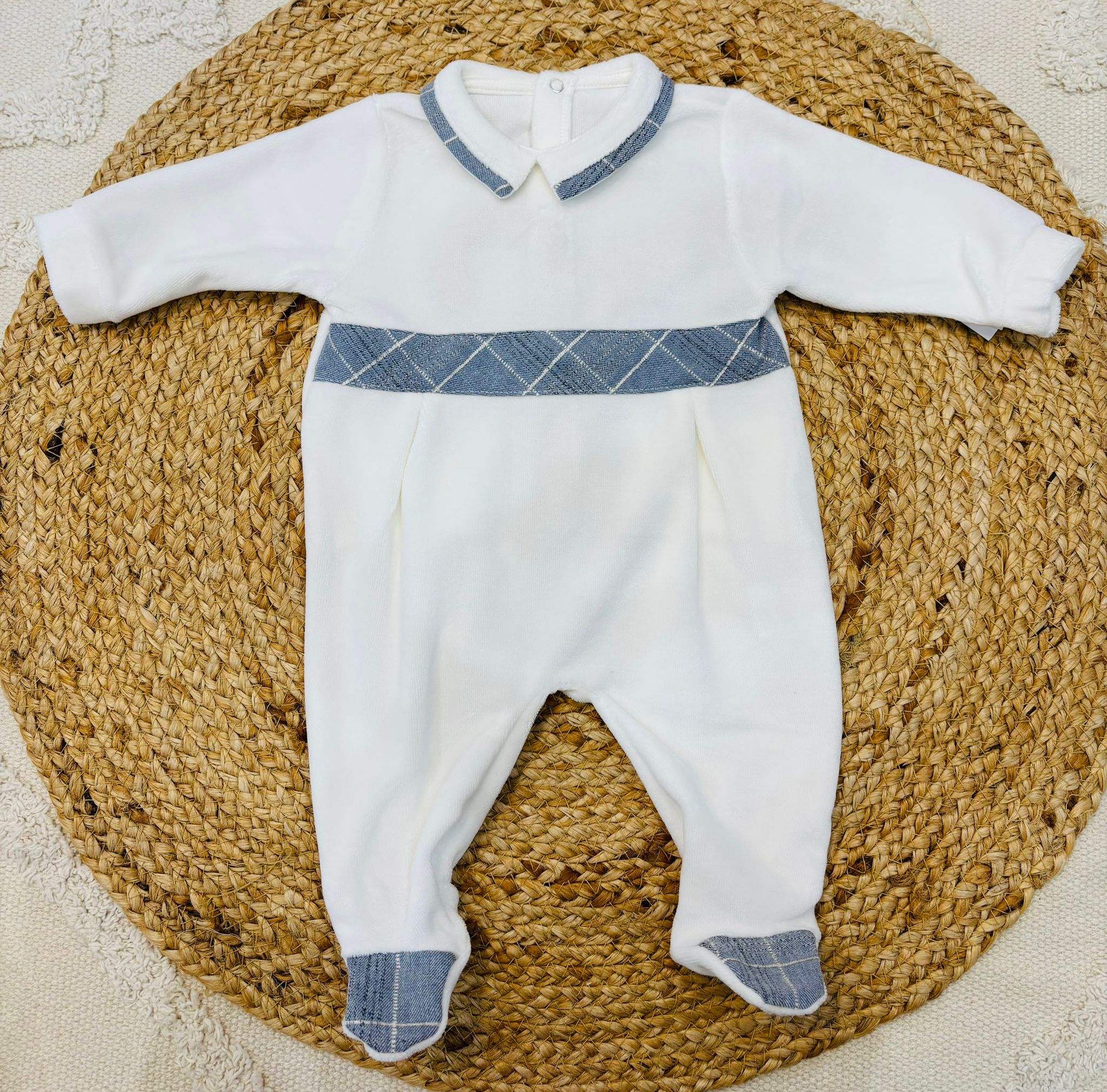 Tutina in ciniglia verde salvia con colletto fantasia, abbottonatura sul retro e pratica apertura al fondo per il cambio del pannolino.