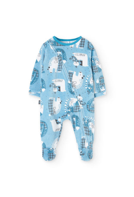Tutina in ciniglia blu con inserti in cotone stampato. Abbottonatura sul retro e pratica chiusura al fondo per il cambio del pannolino