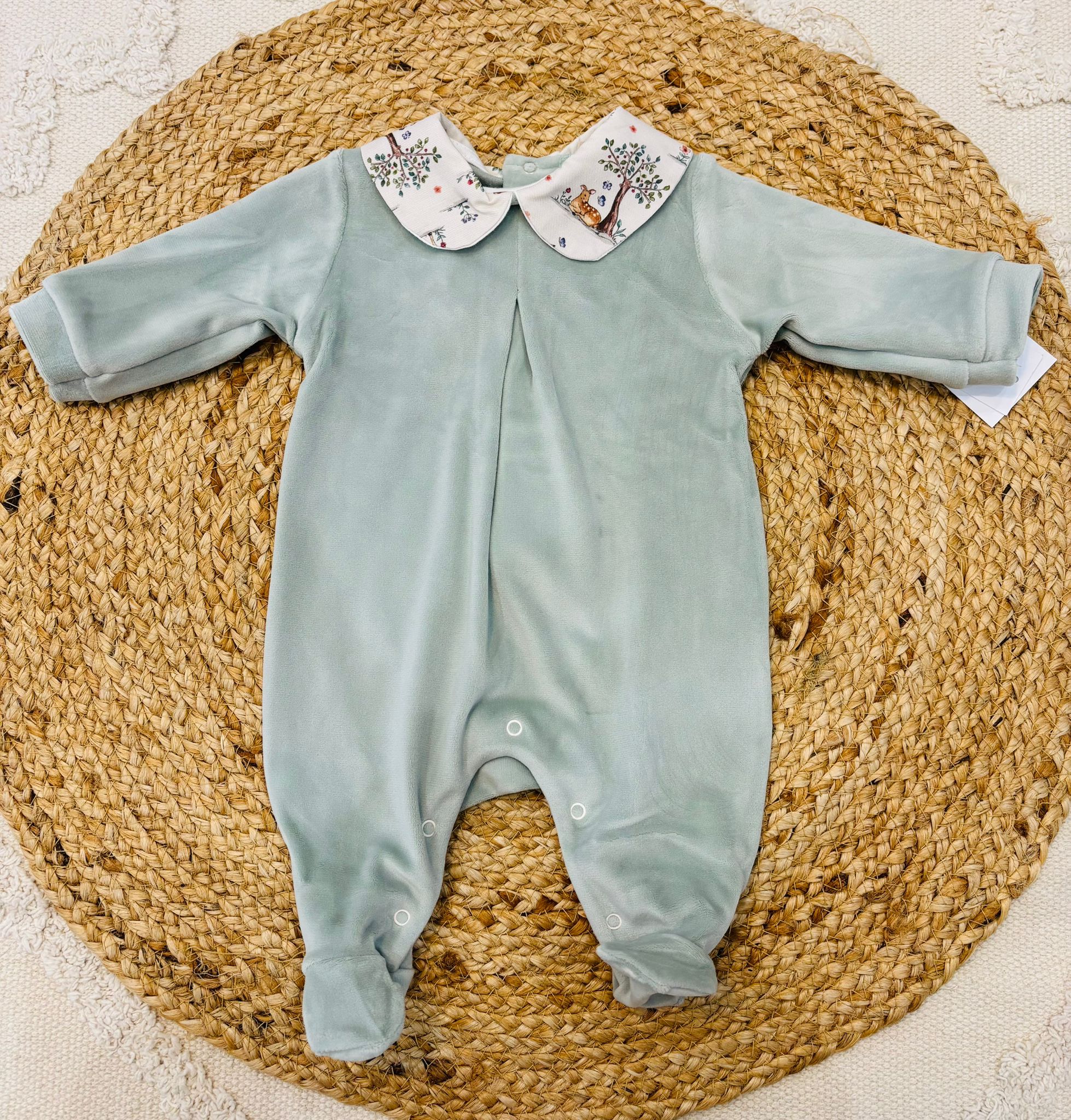 Morbida tutina in ciniglia 2 pezzi con ricamo orsacchiotto sul davanti Pratica apertura con bottoni a clip sul retro.