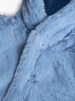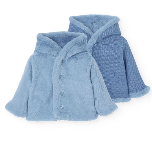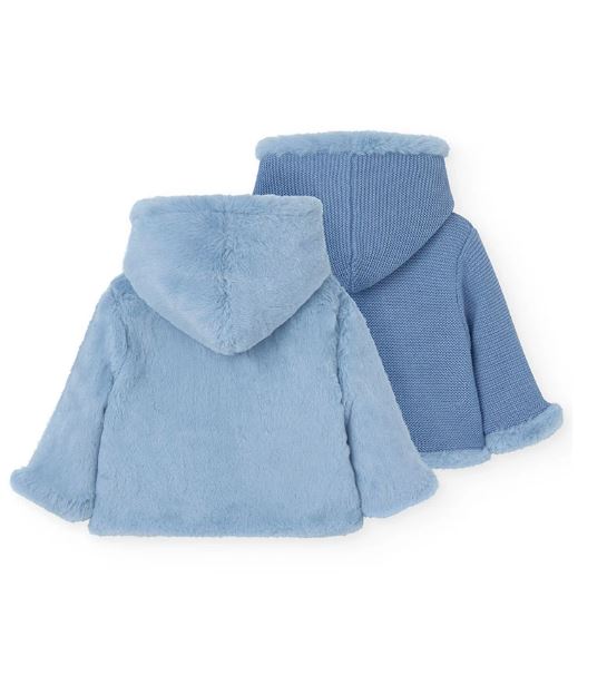 Giacca reversibile ideale per l'inverno. Realizzata in tessuto a maglia, ha un design a tinta unita in un attraente colore blu. La giacca è dotata di cappuccio per proteggere il piccolo dal freddo e di maniche lunghe per tenerlo al caldo. La chiusura a bottoni la rende facile da indossare. È un capo versatile e confortevole, perfetto per le giornate più fredde